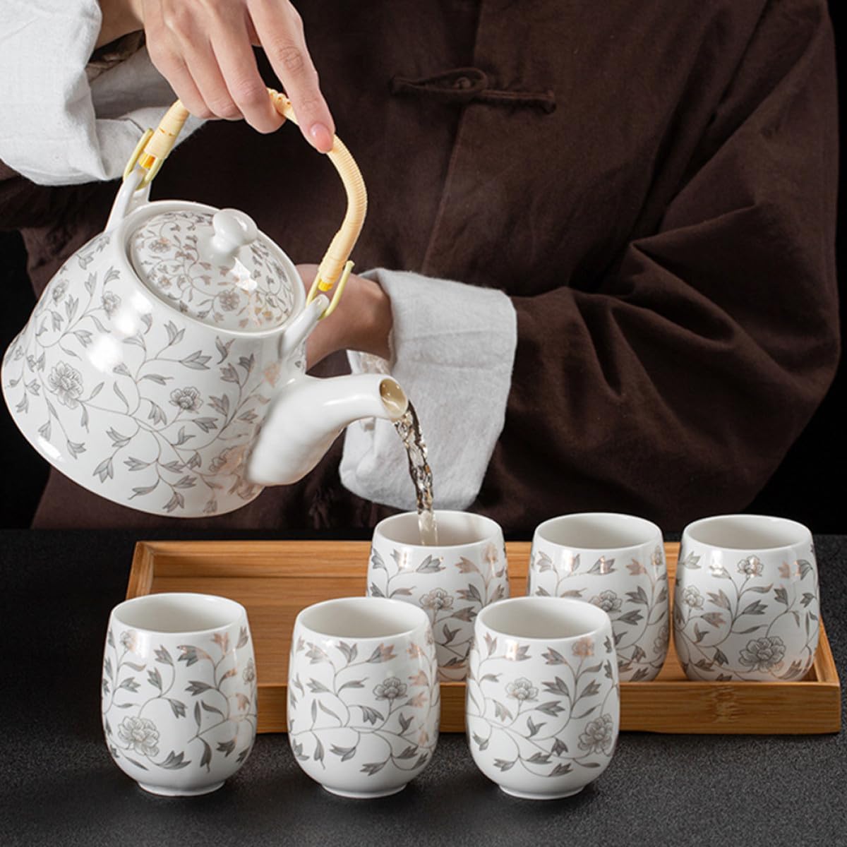 Package List 1 x Tea Kettle 6 x Teacups Characteristics -Size Teapot: Approx. 14.00X14.00X12.00cm / 5.50X5.50X4.72in -Color: White -Product Info:Teapot tea set -Size Teacup: Approx. 5.6X7.6cm / 2.20X2.99in -Material: Ceramic & Stainless Steel & Nylon & Steel Wire - It is easy to clean and wash, which is and convenient Tea Cups. - This tea pot and cup is made of ceramic and other metal material for long time and use. - It is characterized by a sturdy and reliable texture, not easy to break, serving you for a long time teapots. -Capacity; Teapot is about 950ml; Teacup is about 180ml Tea Holder - Smooth surface without burrs, will not hurt or scratch your hands porcelain tea cups. - This tea pot has a simple design, but very practical in use teapots for tea parties.Goods Descriptionporcelain teapot This tea pot is convenient for you to use.teapot Perfect for home, tea shop, restaurants and hotels.tea pots Made of ceramic and other materials, the tea pot and cup is and practical to use.Household Tea Serving Pot Besides, it is also a good water storage container for you