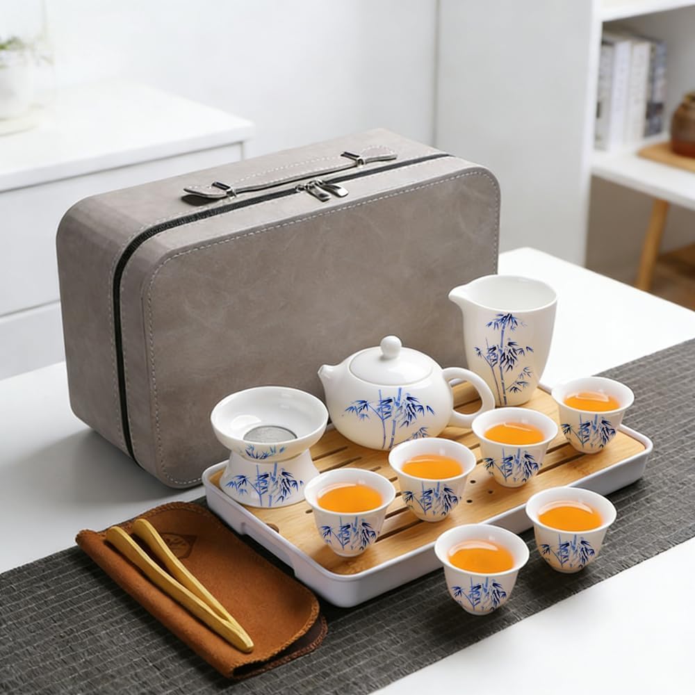 【Ultimate Portability for Tea Lovers Anywhere】 This compact travel tea set is designed to be your perfect companion on the go. Packed in a stylish and durable carry bag, it fits easily in your luggage, backpack, or car. Whether you're camping, on a business trip, or enjoying a picnic, you can savor authentic Chinese tea anytime, anywhere – the ideal portable tea set for modern lifestyles. 【Complete 13-Piece Set for All Your Brewing Needs】 Includes everything for a traditional gongfu tea ceremony: 1 elegant ceramic tea tray, 2 teapots (one can double as a fairness cup), 6 teacups, 1 stainless steel filter, 1 tea tong, 1 cleaning cloth, and 1 premium carry bag. This ceramic tea set provides all the essentials for brewing oolong, pu-erh, black, or green tea with ease. 【Premium Ceramic Craftsmanship】 Crafted from high-quality, lead-free and cadmium-free ceramic, our tea set is heat-resistant and durable, ensuring long-lasting use without cracking or fading. The smooth glaze and exquisite design reflect the elegance of traditional Chinese tea culture, making each sip a delightful experience. 【Versatile Tea Brewing for All Occasions】 Perfect for brewing various teas – oolong, pu-erh, black tea, green tea, or herbal infusions. The built-in filter ensures a smooth, leaf-free pour. Ideal for daily use at home, in the office, or as a special tea ceremony set for gatherings with friends and family – a versatile addition to any tea lover's collection. 【The Perfect Gift for Tea Enthusiasts】 Presented in an elegant gift box, this ceramic tea set makes a thoughtful and impressive tea gift set for birthdays, Christmas, anniversaries, or housewarmings. It's a wonderful choice for anyone who appreciates the art of tea. Backed by our 30-day hassle-free return and replacement policy – purchase with confidence!