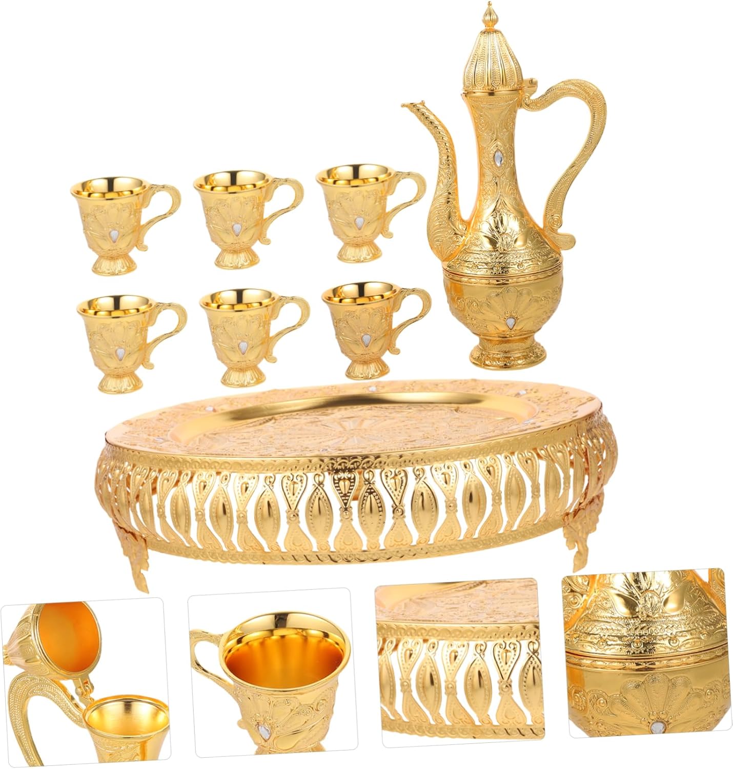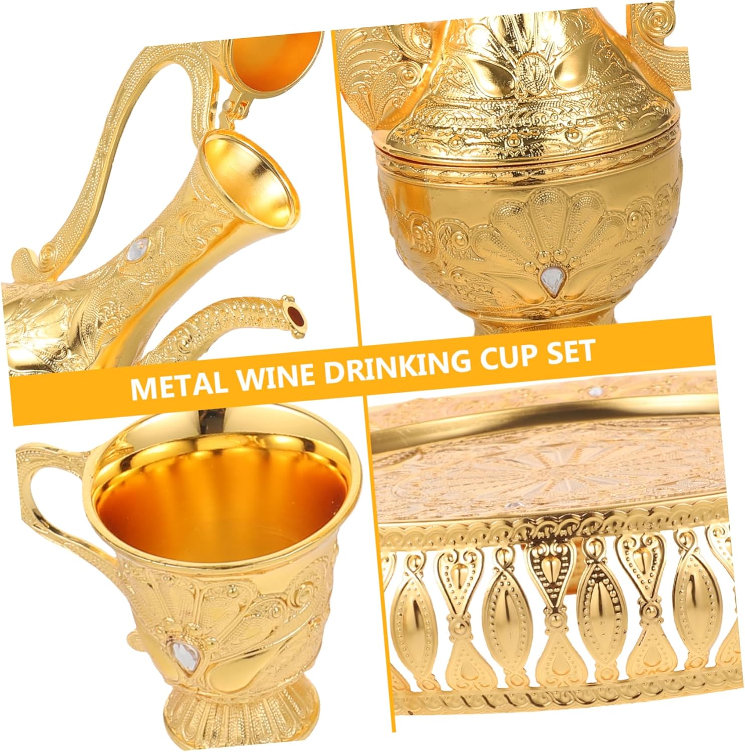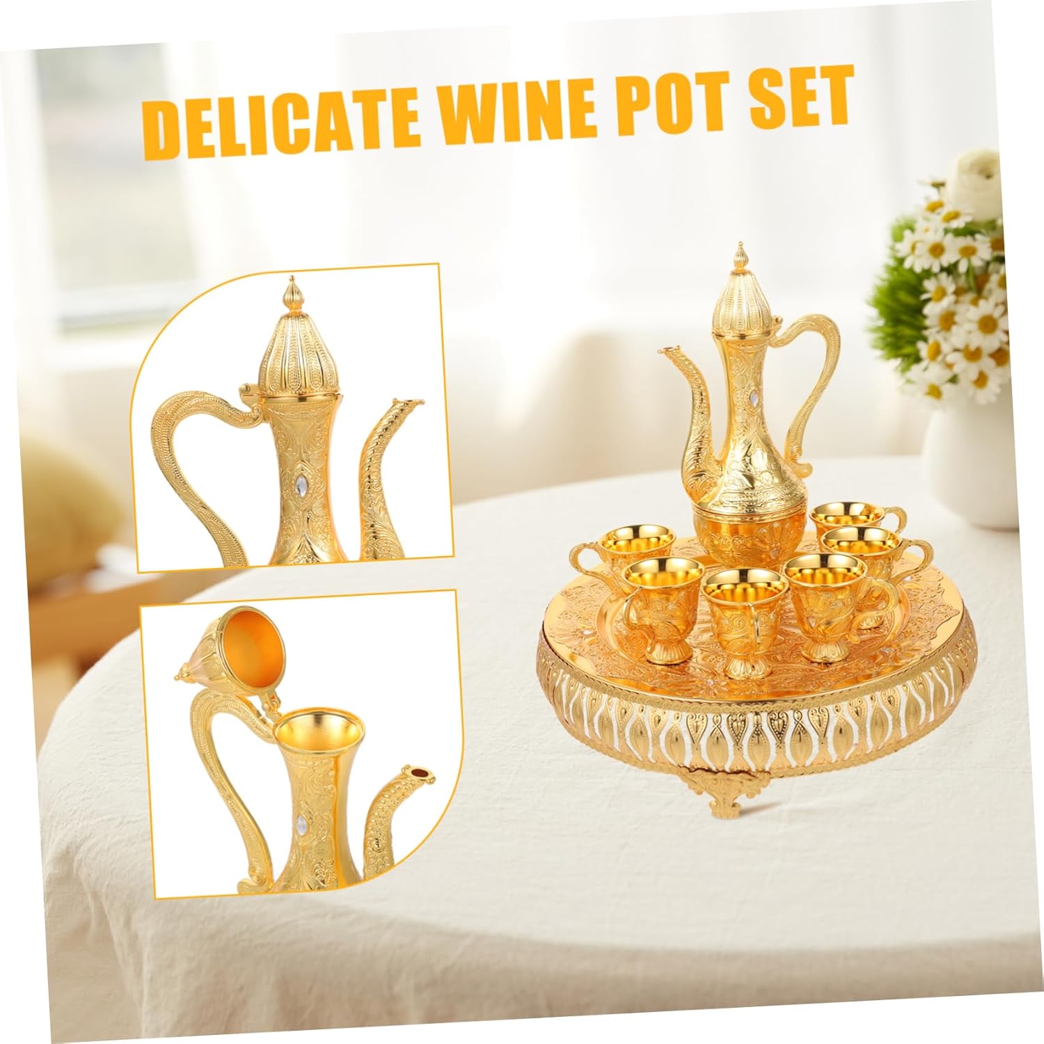 Package Include 1 x Kettle 6 x Cups 1 x Base Characteristics -Size:5.00X4.50X4.50cm/1.97X1.77X1.77in (cup) artistic wine pot -Color:Golden wine pot kit -Material:Zinc alloy turkish tea pot -Size:21.50X12.00X7.50cm/8.45X4.72X2.95in (kettle) metal wine pot -Size:24.50X24.50X7.00cm/9.63X9.63X2.75in (base) retro style wine kettle - Wine cups set with classic style is a enjoy your favorite wine with food wine drinking cup. - The wine pot and wine cups can be used for tea party, also suitable for home decoration, also can be a holiday present wine pot. - Manufactured with zinc alloy, sturdy and practical, which delicate wine kettle. - Decorative and , and this Wine Pot Set is attractive and a decoration for your home home wine pot. - Metal Wine Pot Set, the elegant curved lines of them look very modern and fashionable vintage pot.Goods Descriptionconvenient wine cup And this Wine Pot Set is .practical wine pot kit These wine cups and pot are made of zinc alloy materials, safe and beautiful, can use them with confidence.tea container These wine cups and pot are private gatherings of friends and family, suitable for wine and other spirits