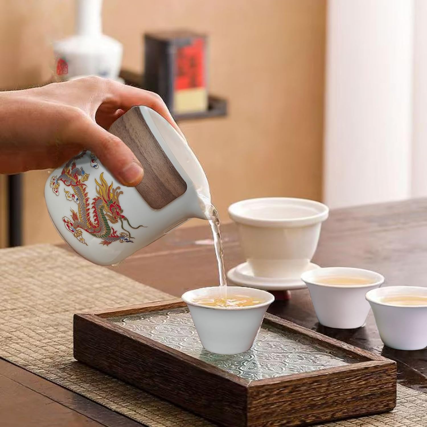 Introducing our Handcrafted Porcelain Chameleon Phoenix Portable Gongfu Tea Set, meticulously designed to enhance your tea-drinking experience wherever you go.Chameleon Feature: Pour hot water at an angle of 45 degrees or more, and watch as the dragon and phoenix patterns on the teapot change from subdued to vibrant colors, adding a mesmerizing touch to your tea-drinking experience.Travel-Friendly Design: Crafted with a lightweight and convenient design, this portable tea set is perfect for tea lovers on the move. Its compact size fits snugly into a portable bag, making it ideal for picnics, camping trips, or office breaks.Multi-purpose Functionality: This exquisite ceramic teapot set is made from high-grade, BPA-free material, ensuring your tea is brewed safely and healthily. Suitable for brewing a variety of teas, including green, black, craft, and fruit teas, it's perfect for business trips, home use, or outdoor adventures.Heat-Insulating Handle: The anti-hot, non-slip handle ensures a comfortable grip while pouring tea. The plum-shaped handle is designed to prevent burns, providing added safety and comfort. The teapot is ergonomically sized to fit comfortably in your hand, making it a joy to hold.Storage and Portability: With its compact and mini design, this tea set includes an infuser and 3*cups, all conveniently stored in a portable bag. It's space-saving and practical for on-the-go tea enjoyment.Gift Set: Packaged in an oriental-inspired kung fu tea set, it's a thoughtful and practical gift for friends, family, or colleagues on various occasions such as birthdays, anniversaries, or housewarmings.Specifications:Teapot Capacity: 10 oz (300ml)Cup Capacity: 1.35oz (40ml) eachMaterial: High-grade PorcelainPackaging: Portable bag for easy storage and transportationThis Travel Pot Chinese Kung Fu Gongfu Tea Set is suitable for brewing different kinds of tea, including Pu-er, Oolong, Green Tea, and more. Whether for personal use or as a unique gift, its traditional handmade craftsmanship, safety features, and versatility make it a perfect choice for tea enthusiasts of all ages.