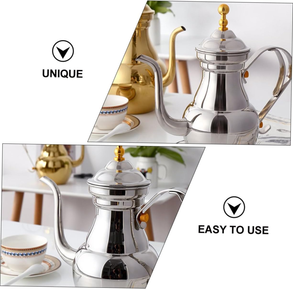 Package Include 1 x Coffee Kettle Features -Color:Silver coffee pouring kettle -Product Info:Stainless steel teapot -Material:Stainless Steel long spout kettle -Capacity:1.5L delicate filter kettle -Size:26.50X13.00X9.00cm/10.41X5.11X3.54in coffee serving pot -Stable stainless steel material, sturdy and not easy to break, which can serve you a long time convenient coffee pot. -The creative design will give you a wonderful experience and bring you a good mood middle eastern style teapot. -User- , safe, no peculiar smell, can be in direct touch with food tea making kettle. -Share with your friends and family because this coffee maker is very practical metal kettle. -Handle and long spout design, easy to use, easy to carry, bring convenience to your life coffee pouring pot.Goods Descriptiontea kettle Simple and easy to operate, you can make coffee by yourselves in leisure time.metal kettle Easy to use, bring much convenience to you.coffee serving pot This coffee pot is made of stable and sturdy stainless steel material, very convenient and safe to use while coffee's quality.pouring pot Comfortable and safe to grip