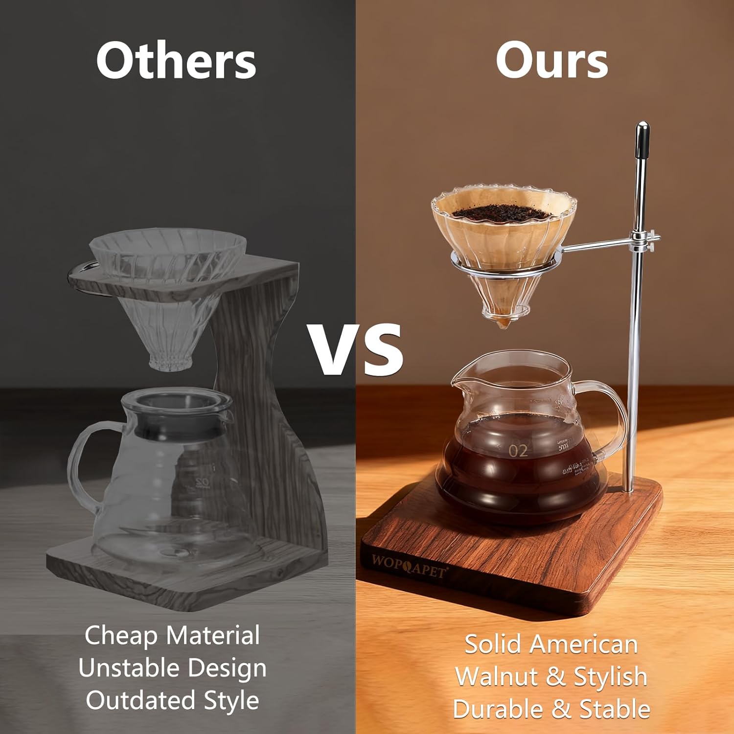 The COZYGIFT North American black walnut pour over coffee stand is designed for brew lovers who want a clean, organized coffee bar with a warm, natural look. A solid North American black walnut wood base pairs with a 304 stainless steel pole and ring to create a durable pour over coffee stand that feels stable when you brew.The 7.08" × 7.08" North American black walnut base adds weight on your counter and helps keep your coffee dripper stand from sliding. The 11.81" pole gives room for most mugs and small servers, and the sliding ring moves up or down and forward or backward, then rotates 360° to center the stream over different cups, carafes and coffee scales.With a 2.64" inner ring diameter, the stand works with many 1–2 cup cone and flat-bottom drippers, including v60-style brewers. Use it as a v60 coffee stand, a dripper holder for your favorite manual brewer, or a way to keep your pour over coffee maker set ready on the counter.This COZYGIFT coffee bar stand fits easily on a kitchen counter, shelf or office desk to build a dedicated pour over coffee station. It pairs with your kettle, grinder and dripper and makes a thoughtful gift for anyone creating a home coffee bar or upgrading from a basic plastic or bamboo stand.For care, wipe the stainless steel parts and keep the North American black walnut base dry after brewing. Avoid soaking the wood or using harsh cleaners. Occasionally conditioning the base with a food-safe oil helps maintain its rich color and grain so your stand stays beautiful over time.