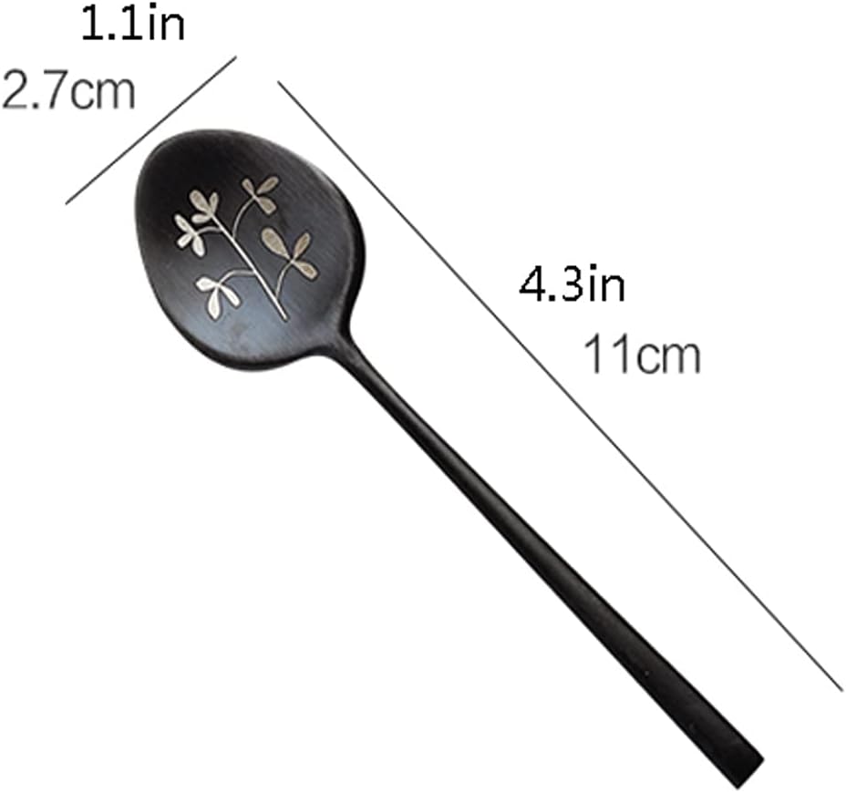 The above data is for reference only, manual measurement of dimensions may have a little error, please allow it, thank you. Material: stainless steel; size: 11x2.7cm; color: gold, silver, black; package: 2pcs High-quality stainless steel, safe and durable, smooth and smooth, meticulously polished, black matt, laser engraved small golden leaves. After mirror polishing, it is as clean as a mirror, easier to clean, and does not hide dirt. Beautiful lines, design in line with the curve of the human hand, comfortable to hold, more comfortable to grasp, and safe to use in daily life. Durability makes it difficult to bend and durable. This series of spoons are elegant and beautiful in design, suitable for your formal activities or daily meals. Notice: 1. Please check the size before buying. Due to manual measurement, an error of 0-3mm will occur. beg for mercy! 2. It does not include items other than the Spoon shown in the product photos. 3. Please note that due to different monitors, there may be slight color difference, please understand. 4. The above data is for reference only, the size is manually measured, each variable may be different, please refer to the actual product, thank you.