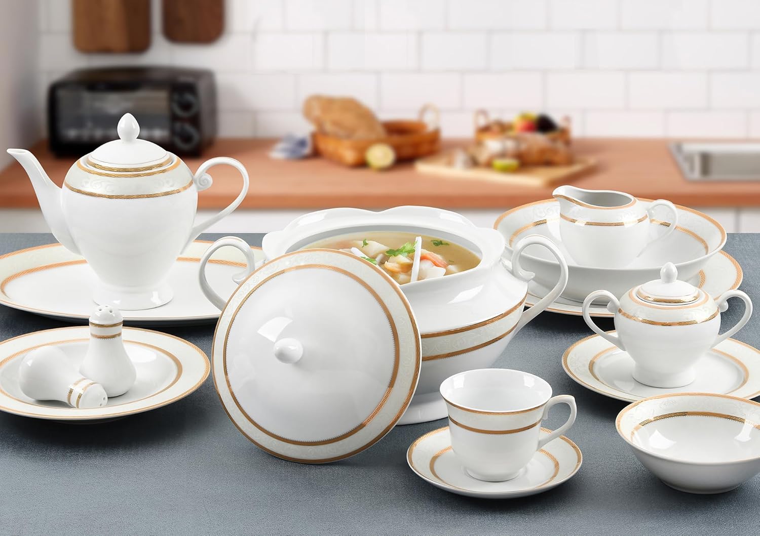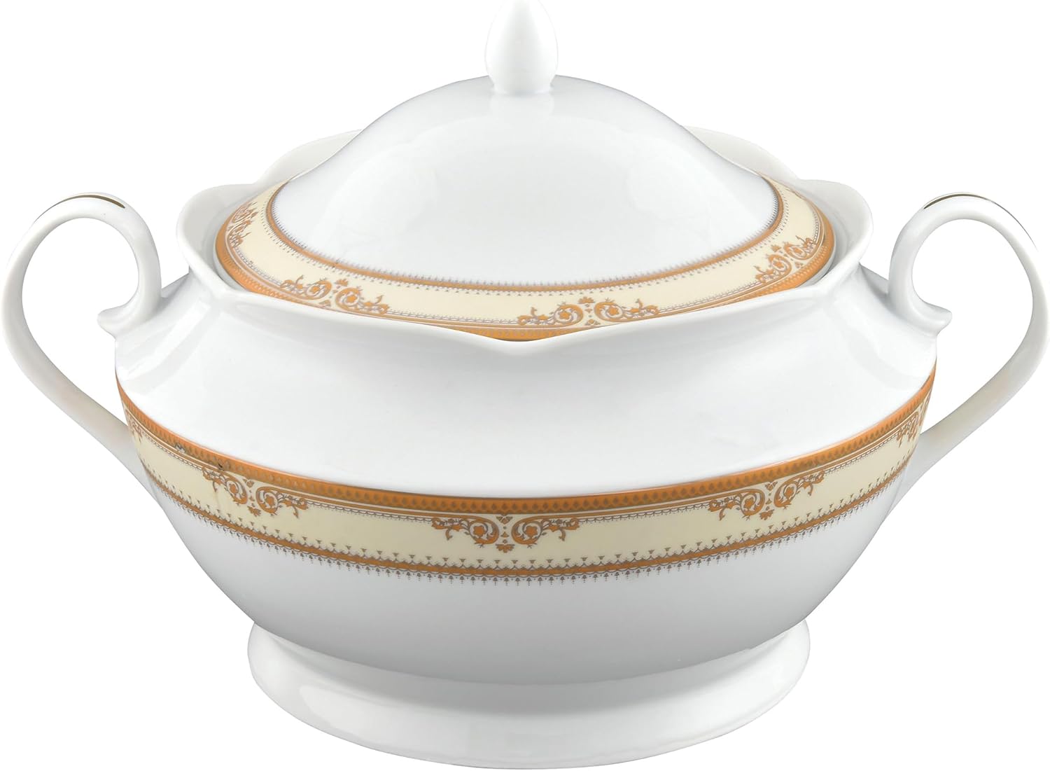 Elevate your dining experience with timeless elegance and reliable functionality. The HOMEHUT Amelia Porcelain Soup Tureen with Lid is a stunning centerpiece that not only enhances your tableโs aesthetic but also makes serving soups, stews, and more an effortless delight. Crafted from high-quality porcelain, this soup tureen combines durable craftsmanship with an ornate, traditional design. Its elegant gold floral trim, smooth ivory-white finish, and scalloped shape reflect European charm and sophisticated taste. Whether you're hosting a formal holiday dinner or an intimate family meal, this piece creates a warm and refined dining atmosphere.Features:Elegant floral gold border for a refined lookScalloped, curved body adds timeless sophisticationLarge 4.25-quart capacity for family-sized portionsDurable porcelain with smooth glazed surfaceIncludes matching lid for optimal heat retentionSide handles ensure secure and easy transportIdeal for hot or cold food service all year roundCoordinates with the Amelia dinnerware collectionPerfect for weddings, holidays, and special events