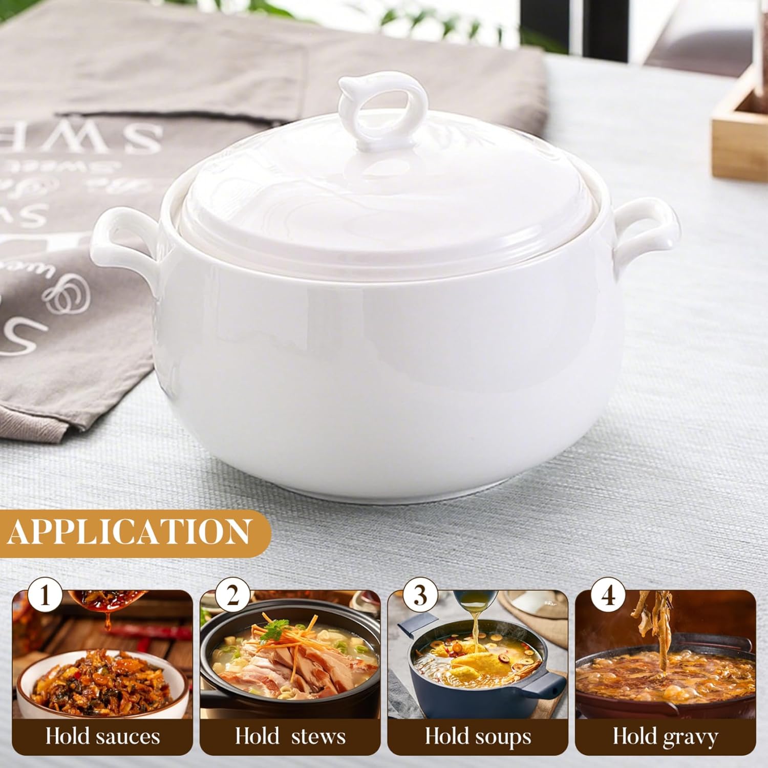 Description: Soup Tureen 3000ml Round Ceramic Serving Bowls with Lids are perfect for home kitchens and restaurants, combining a large capacity with heat-resistant ceramic that retains warmth; equipped with handy side handles and secure lids for easy serving and spill prevention, these microwavable bowls ensure convenient reheating and versatility ideal for soups, salads, making them an elegant and practical addition to your serving ware collection. Features:. -Color: White. -Material: Ceramic. -Size: 27x18.5 cm/10.63x7.28 inch. -Capacity: 3000ml. Note:Manual measurement, please allow slight errors on size.The colors may exist slight difference due to different screens. Package Including 1 * Soup Tureen