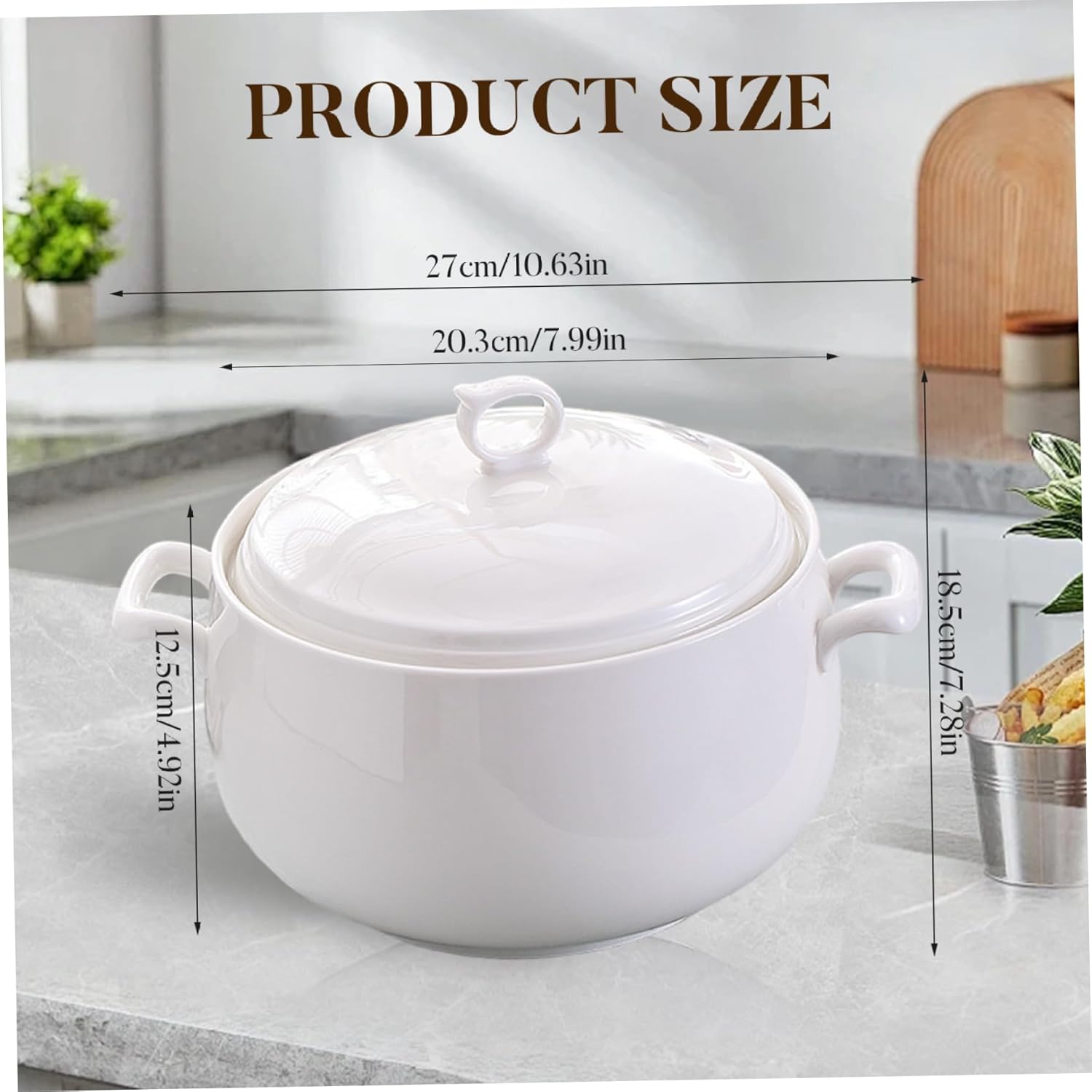 Description: Soup Tureen 3000ml Round Ceramic Serving Bowls with Lids are perfect for home kitchens and restaurants, combining a large capacity with heat-resistant ceramic that retains warmth; equipped with handy side handles and secure lids for easy serving and spill prevention, these microwavable bowls ensure convenient reheating and versatility ideal for soups, salads, making them an elegant and practical addition to your serving ware collection. Features:. -Color: White. -Material: Ceramic. -Size: 27x18.5 cm/10.63x7.28 inch. -Capacity: 3000ml. Note:Manual measurement, please allow slight errors on size.The colors may exist slight difference due to different screens. Package Including 1 * Soup Tureen