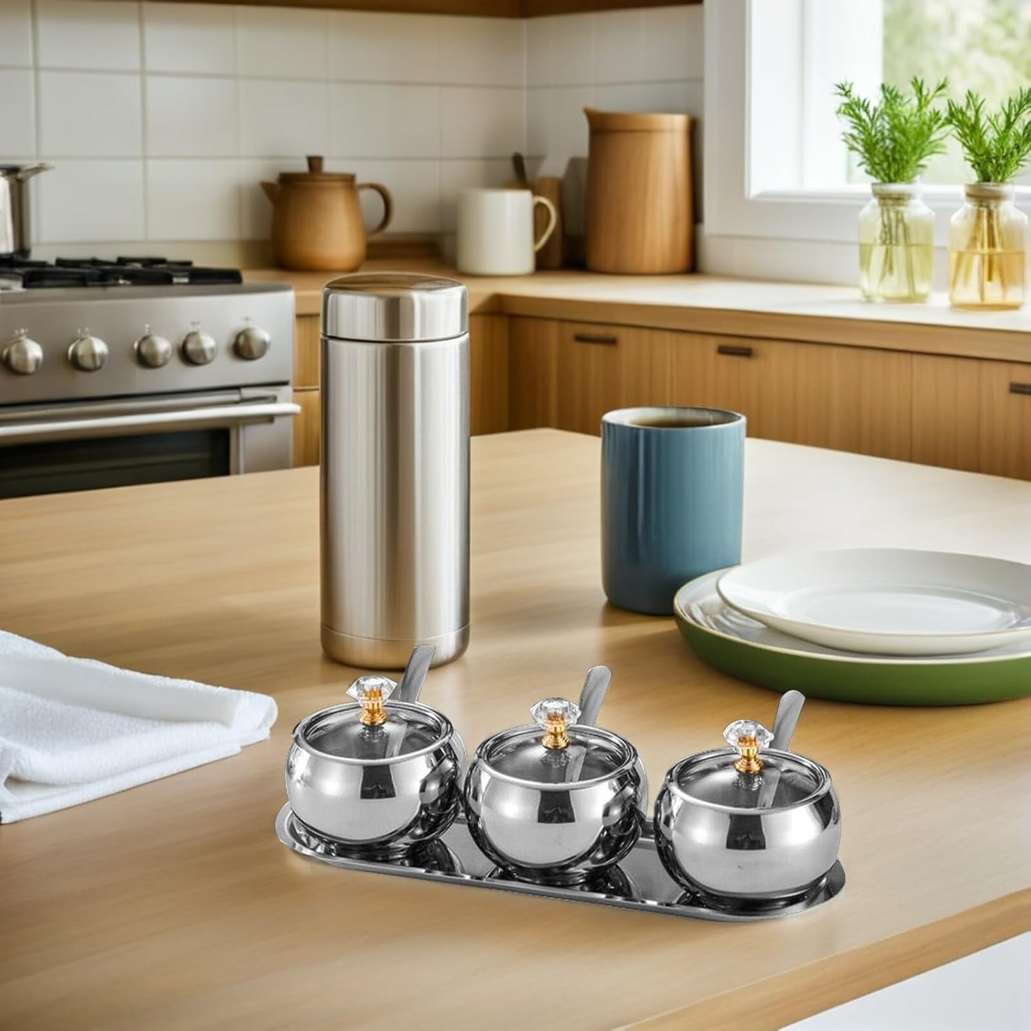 Package List 3 Sets x Seasoning Jars with Lid and Spoon 1 x Organizer Tray Features -Material:Stainless steel -Product Info: Stainless steel seasoning jars -Stylish addition: its modern and elegant design makes it a standout piece in your kitchen, combining practicality with aesthetic appeal stainless steel condiment canisters -Practical accessories: includes a matching spoon and a secure lid, providing convenience and ensuring your condiments stay fresh and ready to use kitchen condiment containers -Versatile functionality: suitable for storing condiments such as sugar, salt, coffee, or spices, this jar set meets a variety of culinary needs seasoning storage organizer -Organized storage: the tray design keeps your jars neatly arranged and prevents spills, helping you maintain a clean and organized cooking space stainless steel condiment pot -Smooth finish: the stainless steel material with a smooth finish offers a simple look and feel, elevating the style of your kitchen while being easy to clean - Color: Silver - Size: 31.50X10.00X9.00cm/12.38X3.93X3.54inGoods Informationkitchen spice boxes Keep your kitchen tidy and your condiments within reach with this stainless steel spice box set.salt storage container The sugar bowl features a lid and spoon, ensuring your ingredients remain fresh.seasoning storage organizer The included tray offers a convenient storage solution, making it suitable for organizing your spices, sugar, salt, or coffee