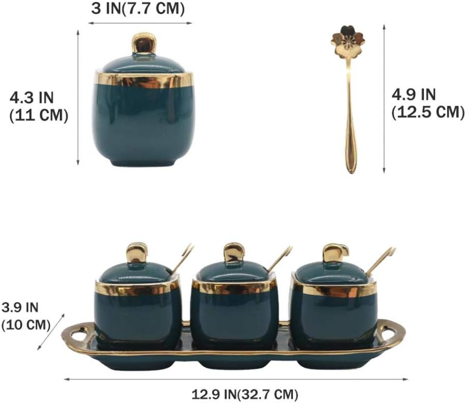 Feature Single Condiment Jar Size: 3L*3W*4.3H Ceramic Containers is a must-have for modern home kitchen, with Lids, Spoons and a tray is perfect for home and kitchen use. Perfect for keeping seasonings / storing condiments, small snacks, sugar, pepper, beans, salt, etc. At your fingertips on the counter where you cook. The covers keep splatters from contaminating the contents. No longer worry about that the salt or pepper dirty your kitchen counter and table. Stop tired the surplus condiments nowhere to please, all kinds of spices to take up your space, make your kitchen life away from the clutter and close the neat. Perfect to be a gift for your friends and family on a special occasion or festival. Packaging includes: 3*Ceramic Sugar Bowl 3*Ceramic Lid 3*Ceramic Spoon 1*Bamboo Tray