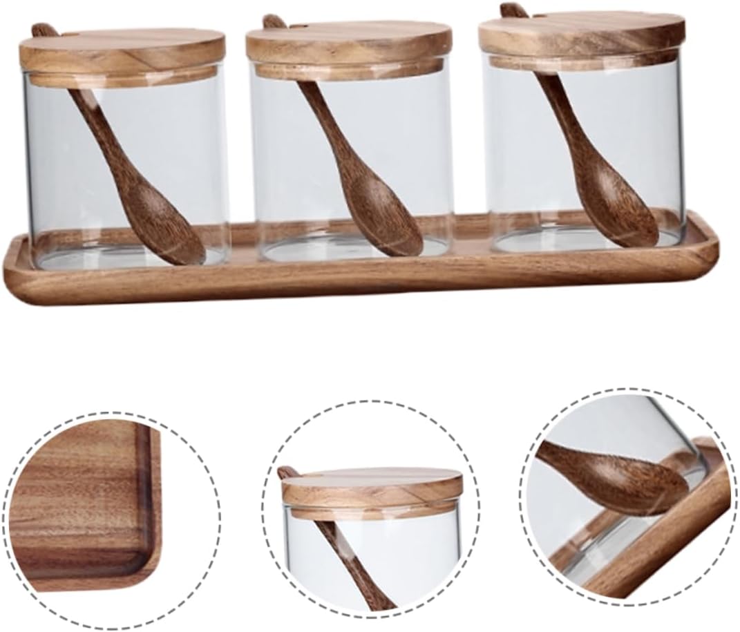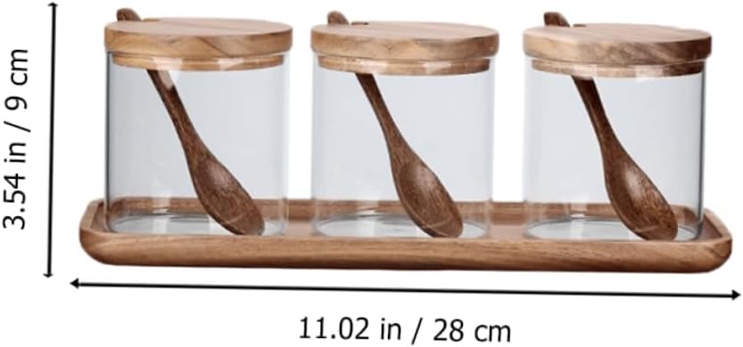 Package Include 3 x Seasoning Jars with Lids 3 x Spoons 1 x Tray Features -Material: Wood, Glass Clear Seasoning Jar -Size: 28.00X10.50X9.00cm/11.00X4.13X3.54in Lidded Condiment Jar -Color: As Shown Seasoning Storage Pot - , and no odor, can directly touch with food Glass Condiment Jar. -Fine grinding process, smooth surface, no burr, comfortable hand feel Seasonings Jar. -Multi-function and design, making cooking more convenient and enjoyable Salt Container. -Waterproof, , , it is easy to clean and use Spice Storage Jar. -Suitable for storing all kinds of seasonings, making delicious food easily and conveniently Condiment Jar.Goods DescriptionLidded Condiment Jar Store your supplies and keep your kitchen tidy and .Clear Spice Jar This is a seasoning storage jar.Salt Container Made of glass material, no smell and .Spice Storage Jar Can put seasonings in, such as salt, pepper powder, neat and convenient, easy to be taken care of