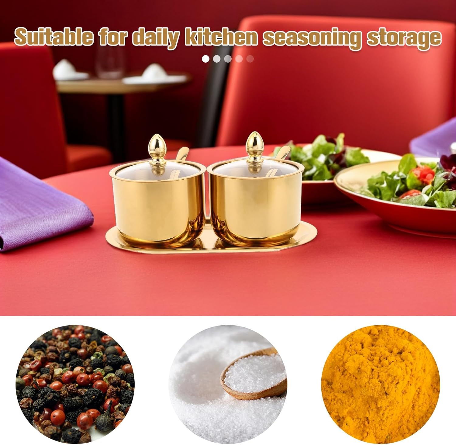 Package List 2 x seasoning jars 1 x storage tray 2 x spoons Features -Product Info: Seasoning jar set -Size:11.00X9.00X9.00cm/4.32X3.54X3.54in (Jar) -Effortless cleaning: features a smooth surface that requires minimal effort to clean, helping you save time and focus on enjoying your meals stainess seasoning jar -Convenient tray and spoon: condiment pot, includes a tray and spoon for easy organization and portability, making it suitable for both indoor and outdoor dining occasions sauce seasoning container -Size:22.00X12.40X10.00cm/8.65X4.87X3.93in -Color:Golden -Clear visibility: the glass lid provides a transparent view of the contents, allowing quick identification of spices and enhancing the overall cooking experience stainless steel seasoning container -Size:13.00X2.00X1.00cm/5.11X0.79X0.39in (Spoon) -Capacity: 400ml/13.5oz tea and sugar containers -Stylish design: the modern aesthetic complements any kitchen decor, making it a thoughtful and practical presents for loved ones on special occasions canister with spoon -Material:Stainless steelGoods Informationstainess seasoning jar The transparent glass lids provide a modern touch and allow quick access to contents.sauce seasoning container This stainless steel sugar container set is designed for effortless organization and storage of spices, sugar, or condiments.stainless steel canister jar Its compact design with a matching tray assures a tidy and stylish presentation for your cooking essentials