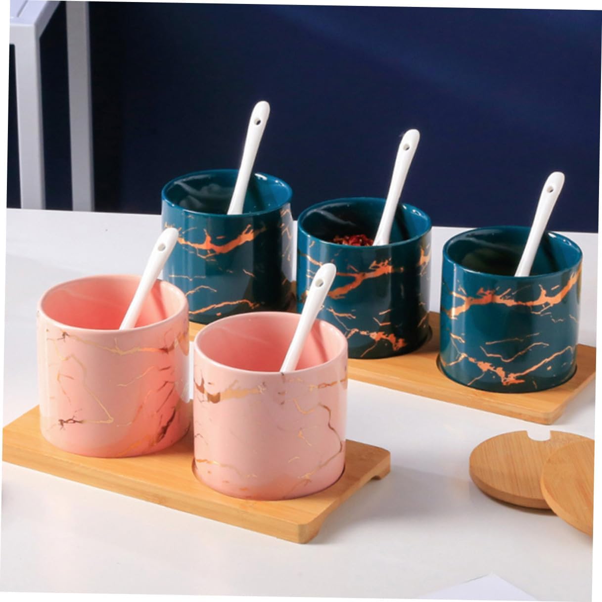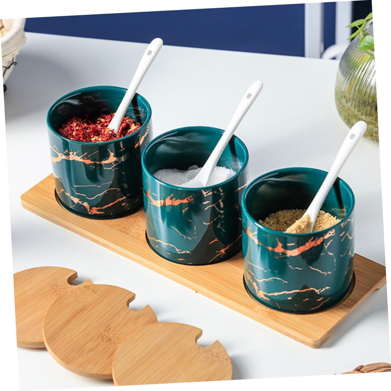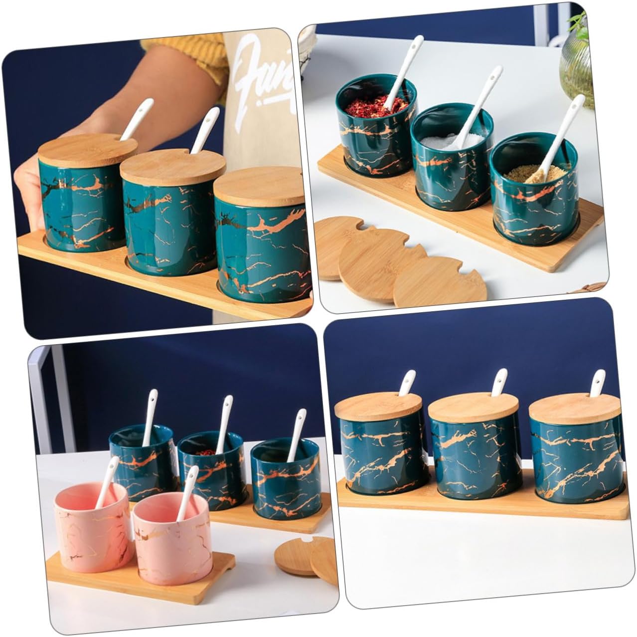 Package List 1 x set of Seasoning Can Characteristics -Color:Multi -Size: About 29.00X10.00X9.00cm/11.40X3.93X3.54inch. -Product Info:Seasoning can set -Material: Ceramic, Wood. - Suitable for storing various seasonings, making food easy and convenient seasoning dispensers. - Fine workmanship, smooth sanding, with lid and spoon, easy to use, sealed, and porcelain condiment container. - seasoning bottle, a good helper for home, restaurant and kitchen cooking condiment jar. - Corrosion resistance and high temperature resistance, easy to clean of oil stains, better use of suit combination spice jars with spoon. - The material is ceramic bottle body, wooden base and wooden cap, environmentally friendly and healthy material, strong and .Goods Descriptioncontainer seasoning material, health and safety.reusable condiment containers with lids With a lid of storage jar and a wooden base, comes with spoons, easy to use, easy to clean.condiment containers Good sealing and not easy to be exposed to moisture.Seasoning Can This is a set of spice jars.Ceramic Seasoning Container They are good helpers for kitchen