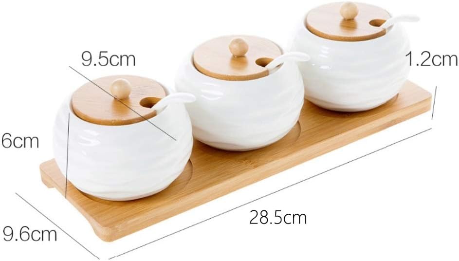 3 seasoning pots with wooden brackets.Save more space, detachable, easy to remove from the bracket and clean.Exquisite design, easy-to-use appearance and excellent appearance.Made of ceramic, it is to your .Dimensions: site, 28.5x9.5 cm.Weight: about 920 gramsMaterial: ceramic + woodOccasion: kitchen, family, dining room, hotel, living room, etc.Features: exquisite shape; easy to clean, beautiful and , practical, dustproofPackage includes: 1 seasoning boxOnly sell main products, not other products