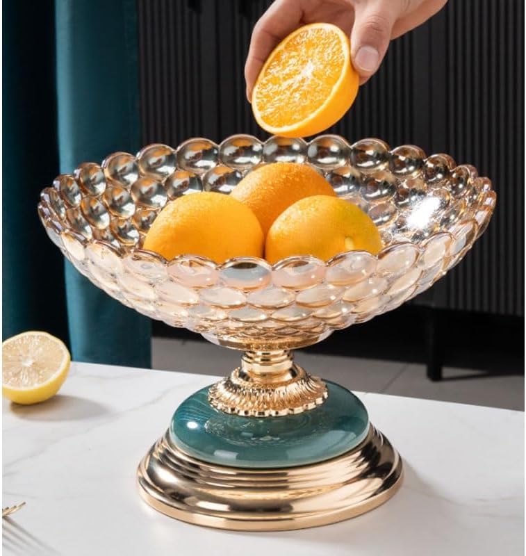 Product: Fruit plateMaterial: Crystal glass + Hardware+CeramicSize: As shownColor: As shownScope of application: families, hotels, coffee shops, etcPackaging: YesTarget users: Candies, fruits and dried fruitsPackaging contents: Fruit platter (other items excluded)Note: Due to manual measurement, please allow an error of 2 to 3 centimeters.Due to lighting conditions, the actual color may slightly differ from the image.gift for housewarming, weddings, birthdays, or Mother's Day. Fits any home from farmhouse