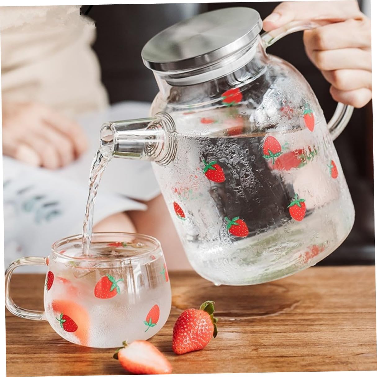 Package Include 1 × Glass Water Pitcher 1 × Glass Cup Features -Size: 12.00X8.00X7.50cm/4.72X3.14X2.95in (Cup) -Product Info:Strawberry pot set -Size: 19.00X13.00X13.00cm/7.47X5.11X5.11in (Glass Pitcher) -Material:Glass, Stainless Steel -Capacity of the glass pitcher: 1.6 L Water Pitcher with Cup -Color:Multi -The reasonable handle design makes the pitcher very convenient to grip, and the cup also easy to hold carafe glass. -It has large capacity to serve your family or entertain your guests, suitable for home, office, restaurant, etc glass jug. -The glass water jug is perfect for holding cold water, tea, beverage, milk tea, coffee, juice and more glass water jug. -This glass water pitcher is designed with strawberry patterns, which is attractive and artistic strawberry glass water bottle. -Manufactured with premium glass material, the pitcher is and can withstand hot and cold water.Goods DescriptionGlass Water Carafes It is a must-have item for your daily life.glass strawberry cup It is suitable for home and hotel use, a perfect pitcher for cold beverages, like water, milk, juice, tea, coffee, etc.strawberry glass cup This water pitcher is made of , heat-resistant and for use