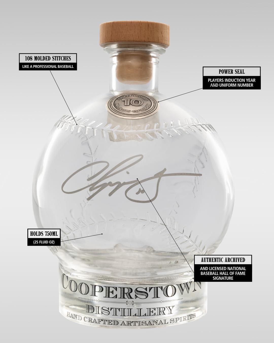 Licensed, engraved and patented signature 750mL decanter created in true baseball spirit by Cooperstown Distillery in participation with the National Baseball Hall of Fame featuring hall-of-famer Chipper Jones.