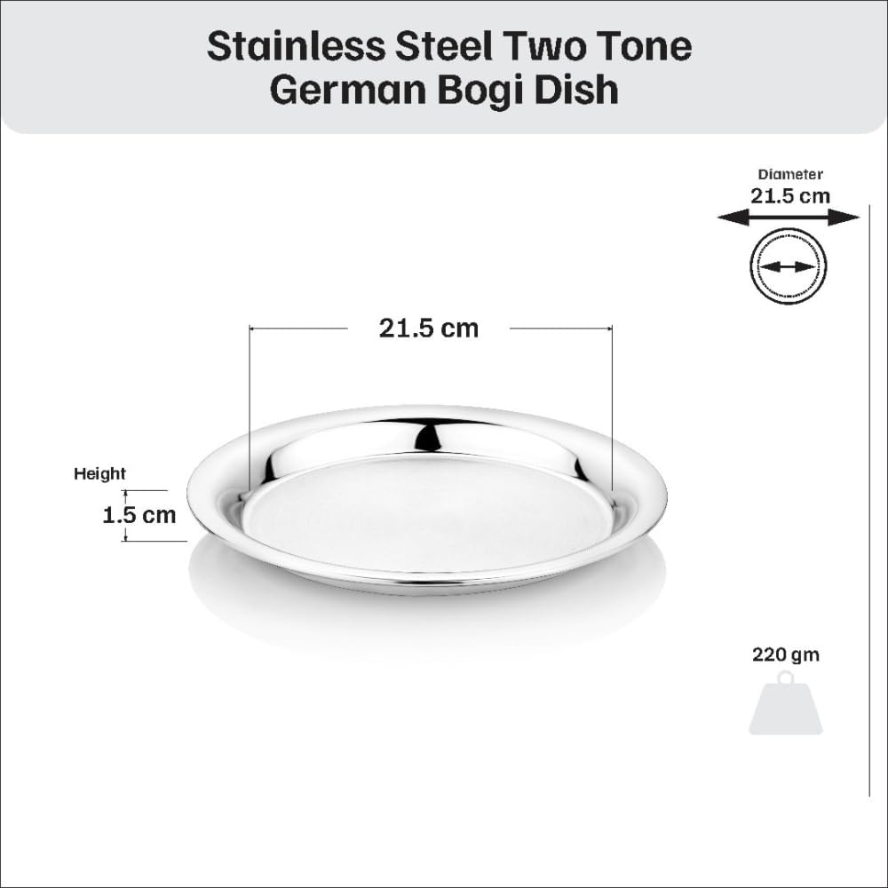 Vinod Stainless Steel set of 6 Two Tone German Bogi Plate has an attractive design & mirror finishing. The serving plate is made up of good quality of stainless steel and is light in weight. Serve & enjoy your favorite food & snacks, without any fear of its falling or scattering. These plates are non breakable and have a long life. They are compact in size and are easy to store in kitchen shelves and cupboards. As the plates are made up of stainless steel, you can serve hot food too. They are easy to clean and maintain. The plates are dishwasher safe. Traditional is New Modern. This dinner plate is designed from 100% food-grade stainless steel with a sturdy Heavy 22 Gauge Thickness. These plates are food-safe, durable and ideal for everyday use.