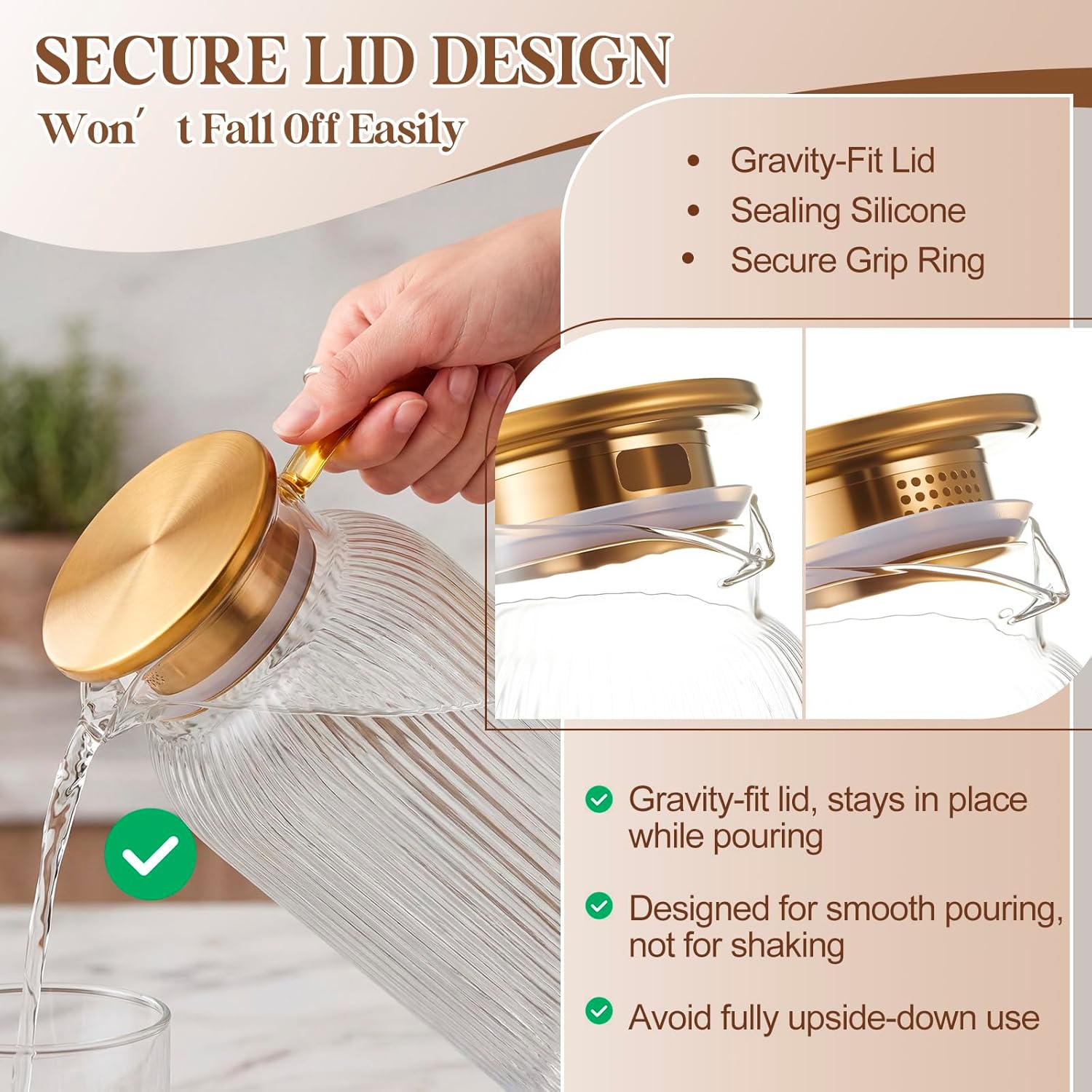 Features: Stylish and functional design: The classic vertical stripes design not only enhances traditional or casual table settings but transforms the pitcher into a table centerpiece. Elevate your dining experience with a functional yet decorative item that will charm your guests. Leak proof assurance: Secured with a soft silicone sealing ring, the lid stays firmly in place, effectively preventing leaks. This thoughtful design means you can pour and serve confidently, knowing your beverages are secure. Specifications: Material: Glass pitcher: 100% lead free heat resistant borosilicate glass Lid: 100% stainless steel Main color: clear Size: about 4.72 x 4.72 x 8.86 inch/ 12 x 12 x 22.5 cm Capacity: about 68 oz/ 2 Liter Package includes: 5 x Glass pitcher with lid 5 x Mini rectangle chalkboard label 2 x Sponge cup brush Notes: Manual measurement, please allow slight errors on size. The color may exist a slight difference due to different screen displays