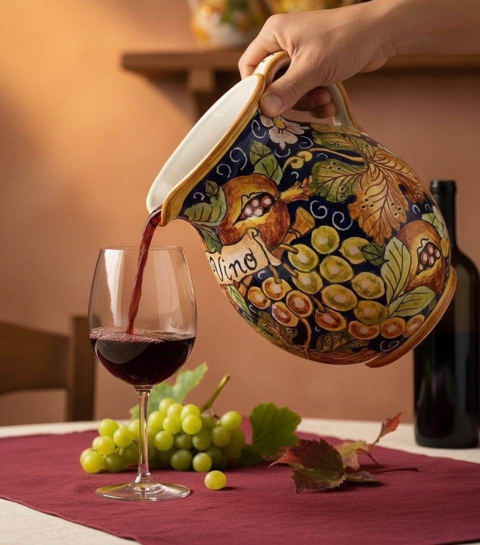 THE TOTAL PRICE INCLUDES CUSTOMS DUTY TAX PRODUCT INFORMATIONCeramic Pitcher Vine.Decoration: Collection Grape ; bunch of white grapes, pomegranate, shaded leaves, small flower, all drawn on a completely blue background, orange / yellow borderDimensions: 7.87 h Inch x 7.08 Inch x 4,72 mouth diameter-- Capacity approx : U.S gal 0,264PRODUCT INSTRUCTIONSAll our products are lead-free and can be used for foods . Dishwasher safe Do not use in microwave Do not use in oven