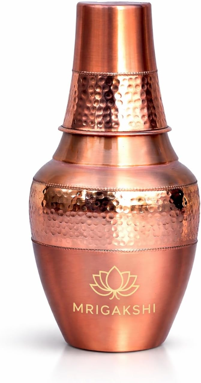 Experience the Mrigakshi "Tamra Jal" Ritual Elevate your hydration with the Mrigakshi Pure Copper Carafe Set, where traditional Indian craftsmanship meets modern health needs. This 1300ml set is specifically designed for those who want the benefits of a copper water bottle with the elegance of a bedside pitcher. Why Choose the Tamra Jal Series? In Ayurveda, water stored in a copper vessel (Tamra Jal) is believed to have the ability to balance the three doshas in your body. Our carafe is handmade by skilled artisans using centuries-old techniques, ensuring you get the most authentic experience possible. Functional Elegance for Home & Office Whether placed on your nightstand for a morning health ritual or on your office desk to stay hydrated throughout the day, this set stands out. The tumbler-over-carafe design keeps your water protected from dust while providing a seamless drinking experience. Product Specifications: Material: 100% Pure High-Grade Copper Capacity: 1300ML (44 oz) Finish: Hand-Hammered & Smooth Antique Finish Authenticity: Laser-etched Mrigakshi Brand Logo