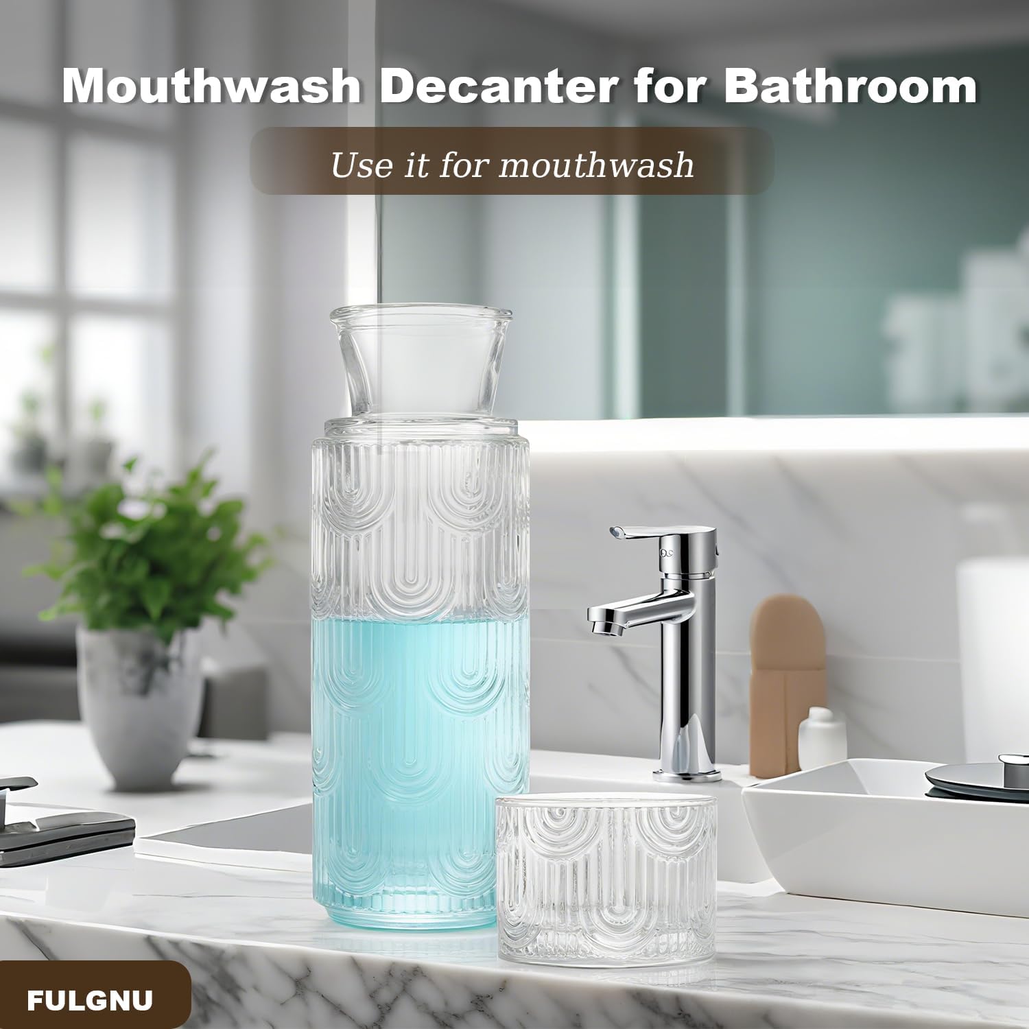 Bedside Water Carafe and Glass Set of 2 Including a clear bedside water carafe and green mouthwash decanter