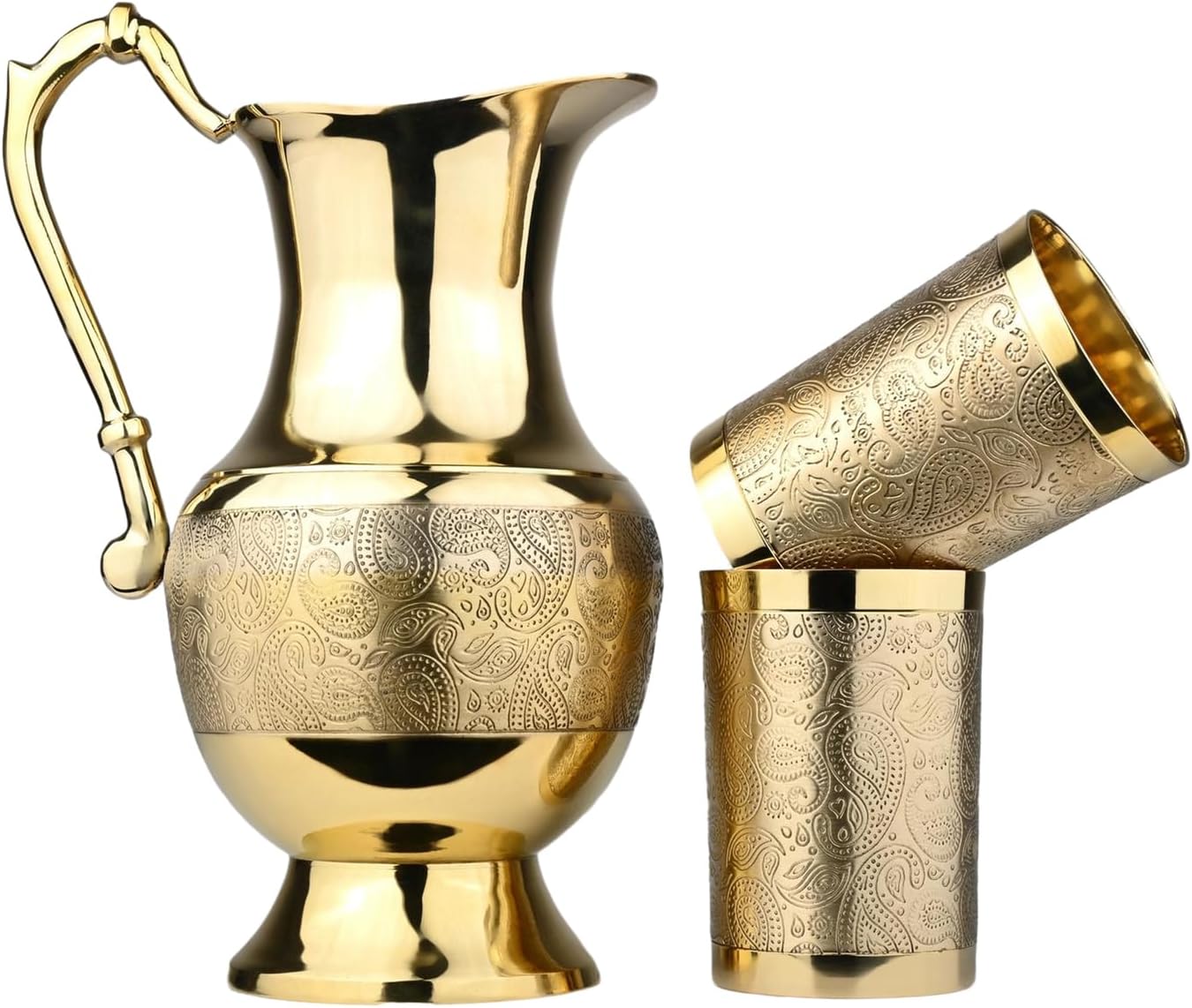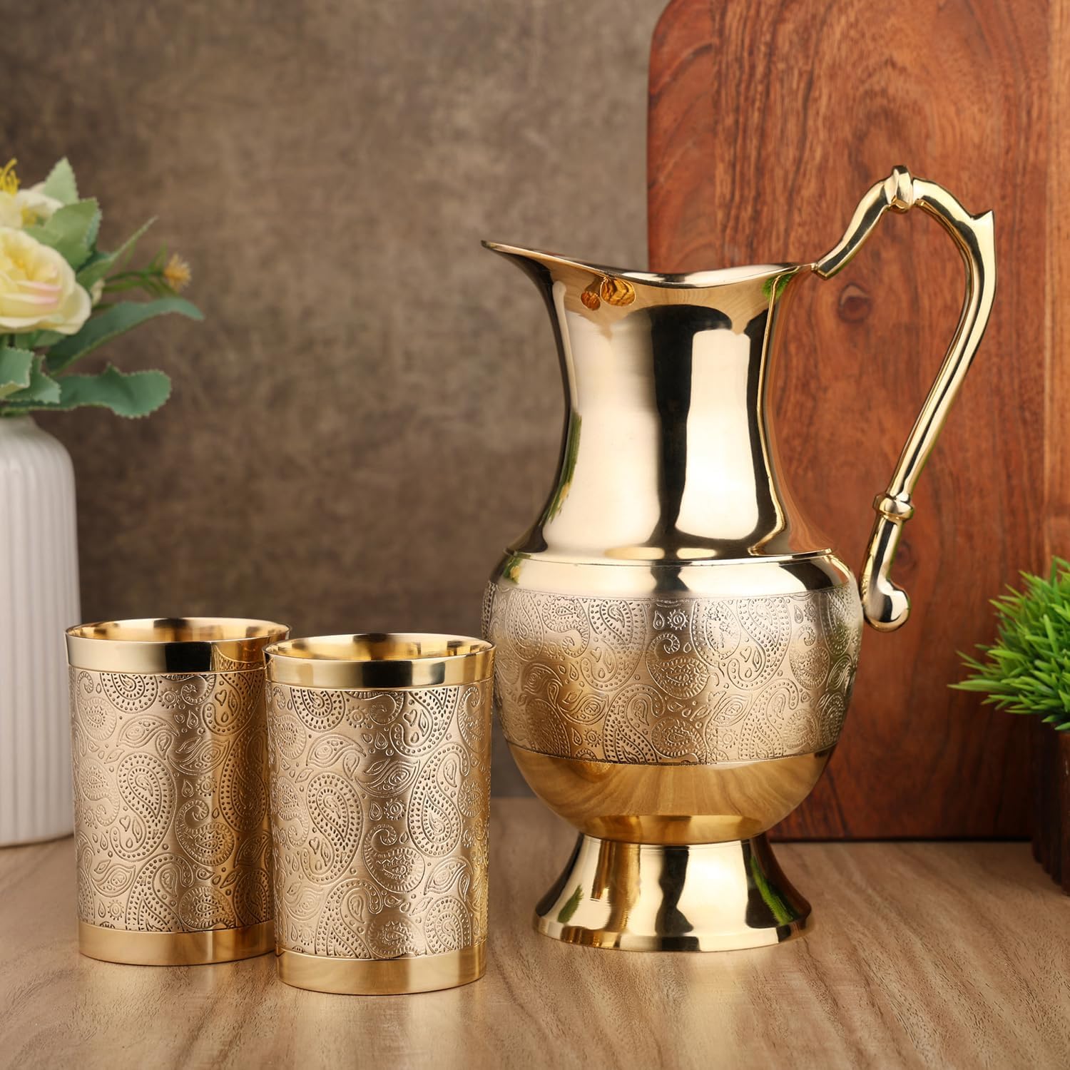 Enhance your home with the timeless beauty and health benefits of this Pure Brass Jug Set with 2 Tumblers Handcrafted by skilled artisans, this eco-friendly brass drink ware set features an elegant etched floral design that blends tradition with luxury. Made from 100% pure brass. Perfect for serving water, this 1 Jug and 2 Tumblers set is durable, reusable, and ideal for daily use or gifting. Add a touch of heritage to your home with this exquisite brass serve ware set.