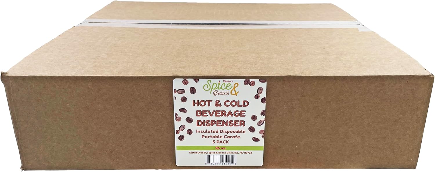 Item Package Quantity:5 | Size:96 oz This 96 oz. coffee/hot/cold beverage take out container's inner bag automatically inflates when poured into, so filling is quick and sanitary. With its compact design for minimal storage space this coffee/beverage to go container is a perfect way to add bulk coffee/beverage take out to your kitchen or business.