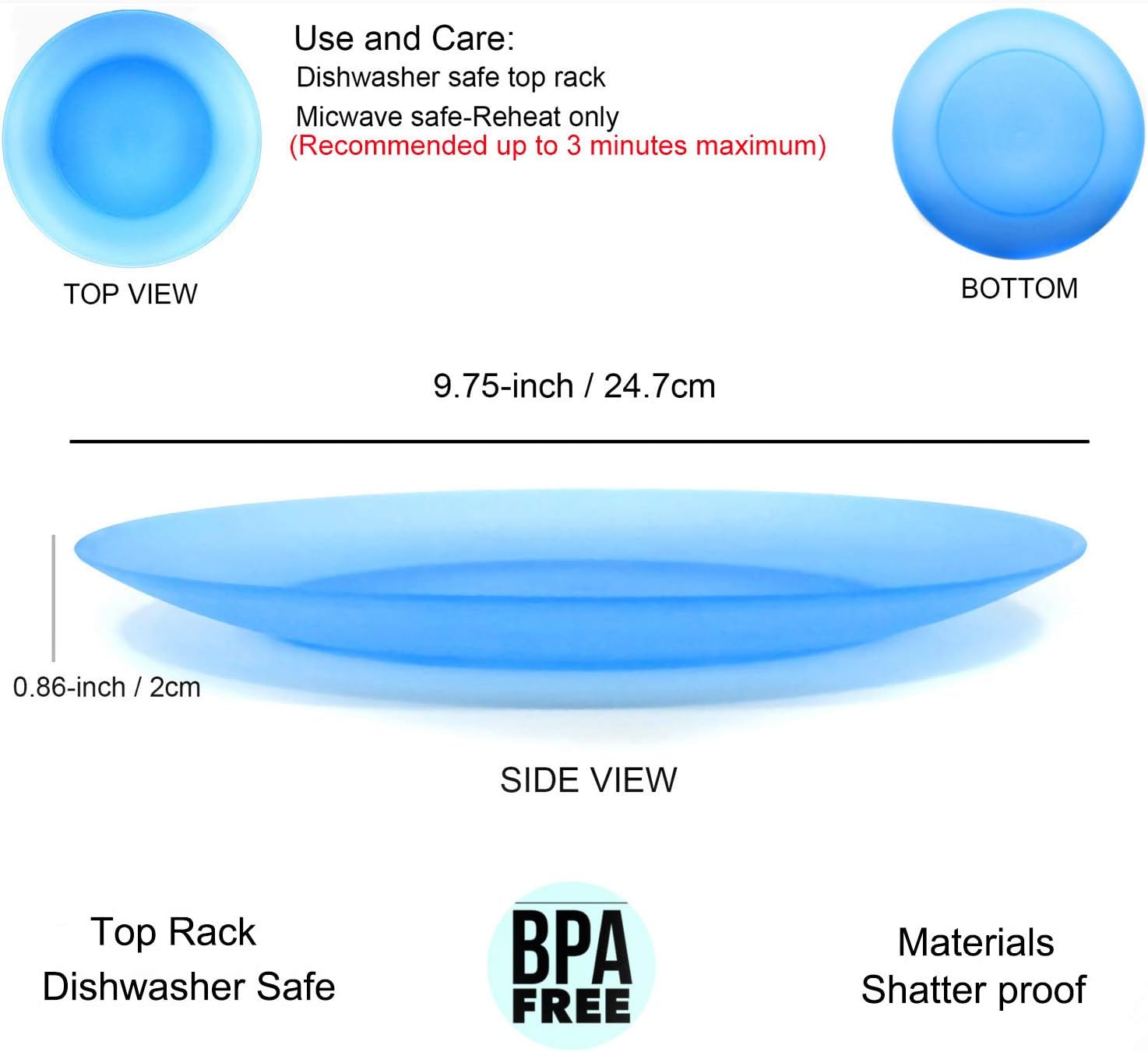 Are you tired of the fragile plates set? Are you looking to add a colorful bowl set to your kitchen or eating tableware? Just choose this Colorful plates set! Unbreakable and sturdy plates for snack, salad,food or meal- lunch or dinner.Made of restaurant quality BPA-free material, Different from porcelain and ceramic, plastic plates will not easy break. Easily wash in the dishwasher or by hand. BPA FREE. Size: Diameter 9.875 Inch, set of 12 for everyday use. Colorful makes the plates look more nice and elegant, great to decorate any tableware. This plates set also best household gift choose for your family and friends.