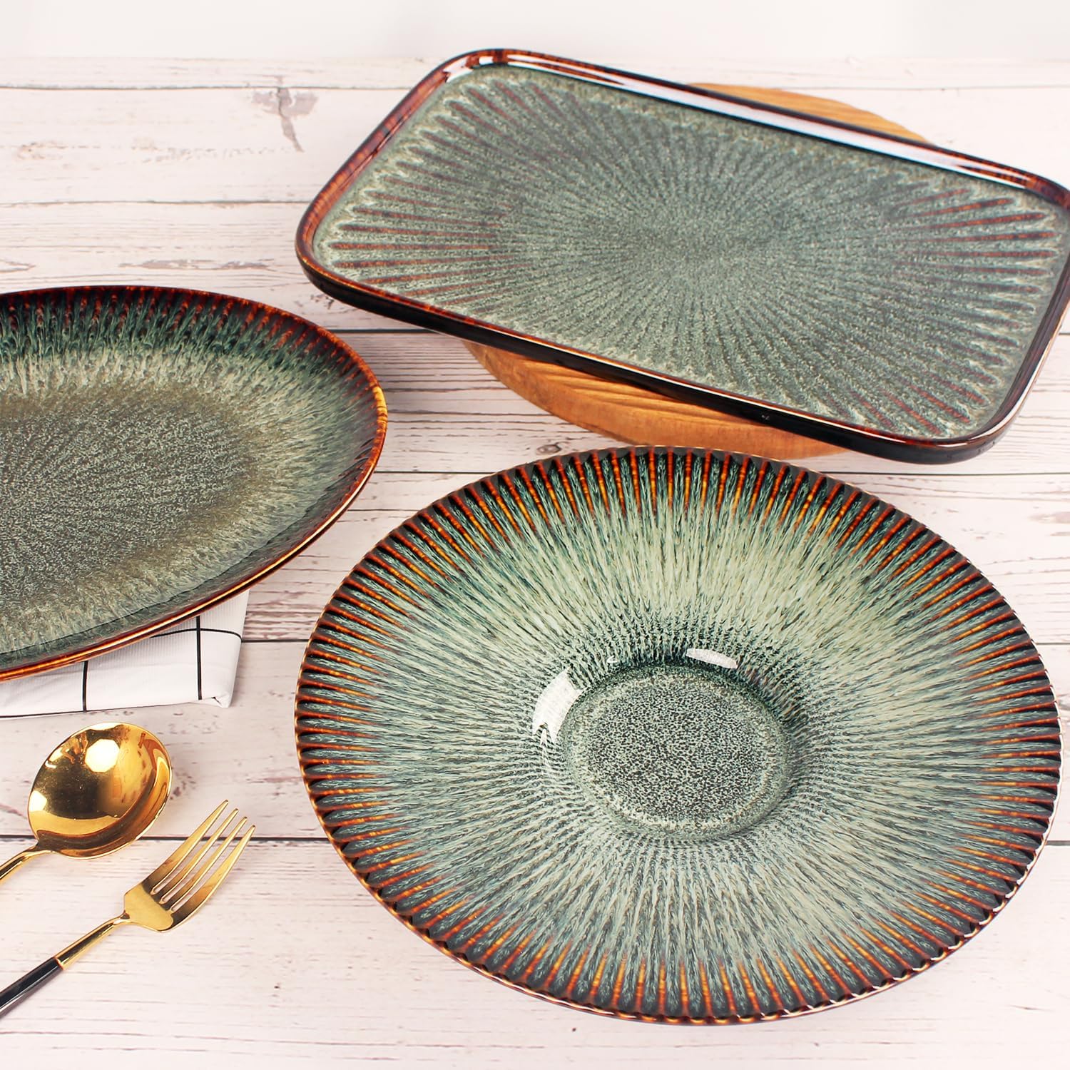 LIUYWYHCF Ceramic Dinner Plates Set of 4, 11.8 Inch Large Serving Dish for Kitchen, Stoneware Dinnerware Plates for Pasta Salad Steak Pizza, Scratch Resistant, Microwave & Dishwasher Safe SIZE - This dinner plates featuring a unique glaze that radiates natural elegance. These 11.8-inch plates are versatile, perfectly accommodating any dish from hearty steaks to decadent desserts. Elevate everyday meals and special occasions with these exquisite dining essentials. ELEGANT AND STYLISH DESIGN - This dinner plates leads the dining trend with its expressive colors and finishes. With its vibrant color palette and captivating finishes, it creates an alluring ambiance that exudes warmth. The eye-catching reactive glazes and rich, vivid hues not only soothe the senses but also elevate your dining experience. The generously-sized plates provide ample space for displaying your delectable creations, while their deep bottoms prevent any sauce from spilling over. LEAD FREE EAT SAFTY - Our dinner plates set is made of Ceramic material and features an all-natural glaze that is lead-free, cadmium-free. The set is fired at a high temperature of 2340℉ for 17 hours to ensure its durability and safety. With this dinnerware set, you'll never have to worry about any health problems. Withstands 500 F°, for Oven, Dishwasher and Microwave Safe. UNIQUE AND SCRATCH RESISTANT - Our ceramic dinner plates sets are fired with two different glazes,The reactive glaze make every plate is unique,Since our glaze is all-natural reactive finish, the surface of plates would change color on lighting,So Our glaze is also extra strong to prevent scratches from your knives and forks. Please note dark marks may occur silverware, which are not scratches,it is very easy to remove. ELEVATE EVERY MEAL - Perfectly blends affordability and modern design into our dinner plates. Whether it's a comfortable family breakfast or a lively gathering with friends, our fashionable cutlery collection can enhance your dining experience in any occasion.
