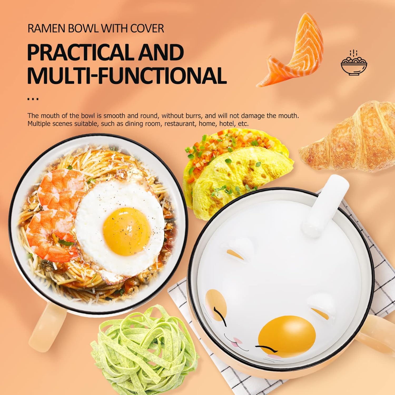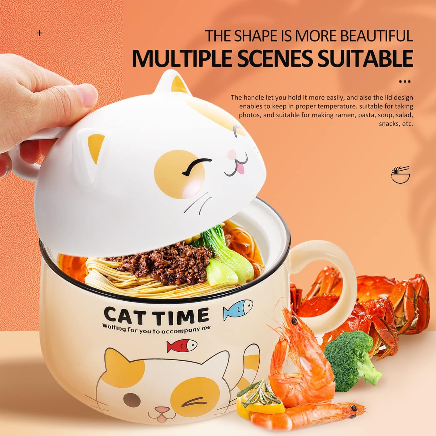 Package Include 1 x Instant Noodles Bowl Features -Size: 18.00X15.00X15.00cm;/7.07X5.89X5.89in; cartoon bowl -Color: yellow decorative ceramic bowl -Material:Ceramic instant ramen noodle bowl -Multiple scenes suitable, such as dining room, restaurant, home, hotel, etc adorable bowl. -Using ceramic material and with fine craftsmanship, and strong soup bowls. -The mouth of the bowl is smooth and round, without burrs, and will not damage the mouth instant noodle bowl with lid. -The bowl can use as rice bowl, soup bowl, salads bowl, and multi-functional rice bowl. -It is easy and convenient to clean, and easy to store when not in use ramen bowl ceramic.Goods Informationceramic noodle bowl With enough capacity, the bowl is and to store soup, salad, porridge, rice and more.noodle bowl The handle let you hold it more easily, and also the lid design enables to keep in proper temperature.noodle bowls This is a bowl designed of look and smooth surface that you can use easily