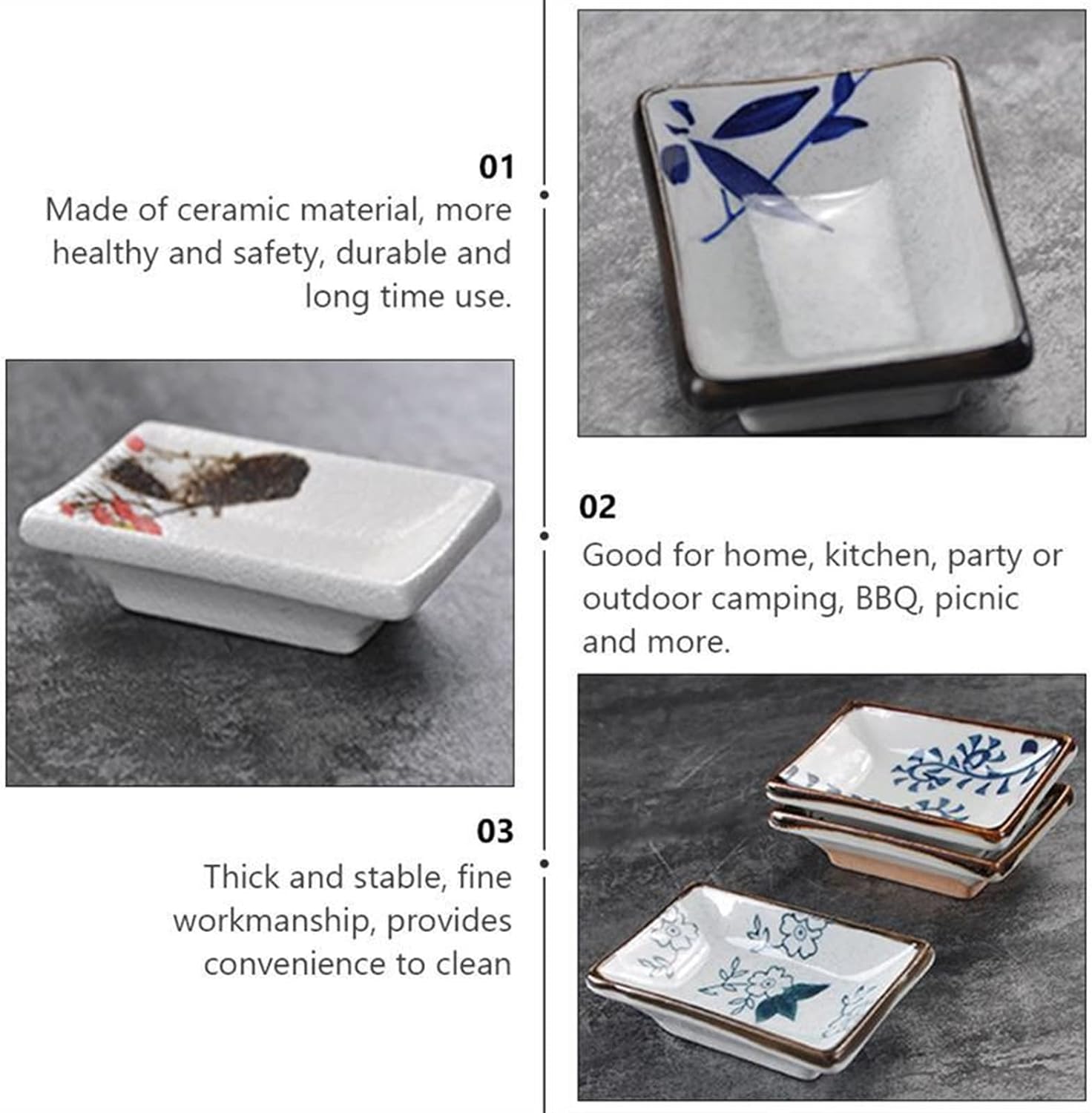 • Suitable for holding sauce, salt, vinegar, sugar, salad, flavor, spices, snack and appetizers, etc.