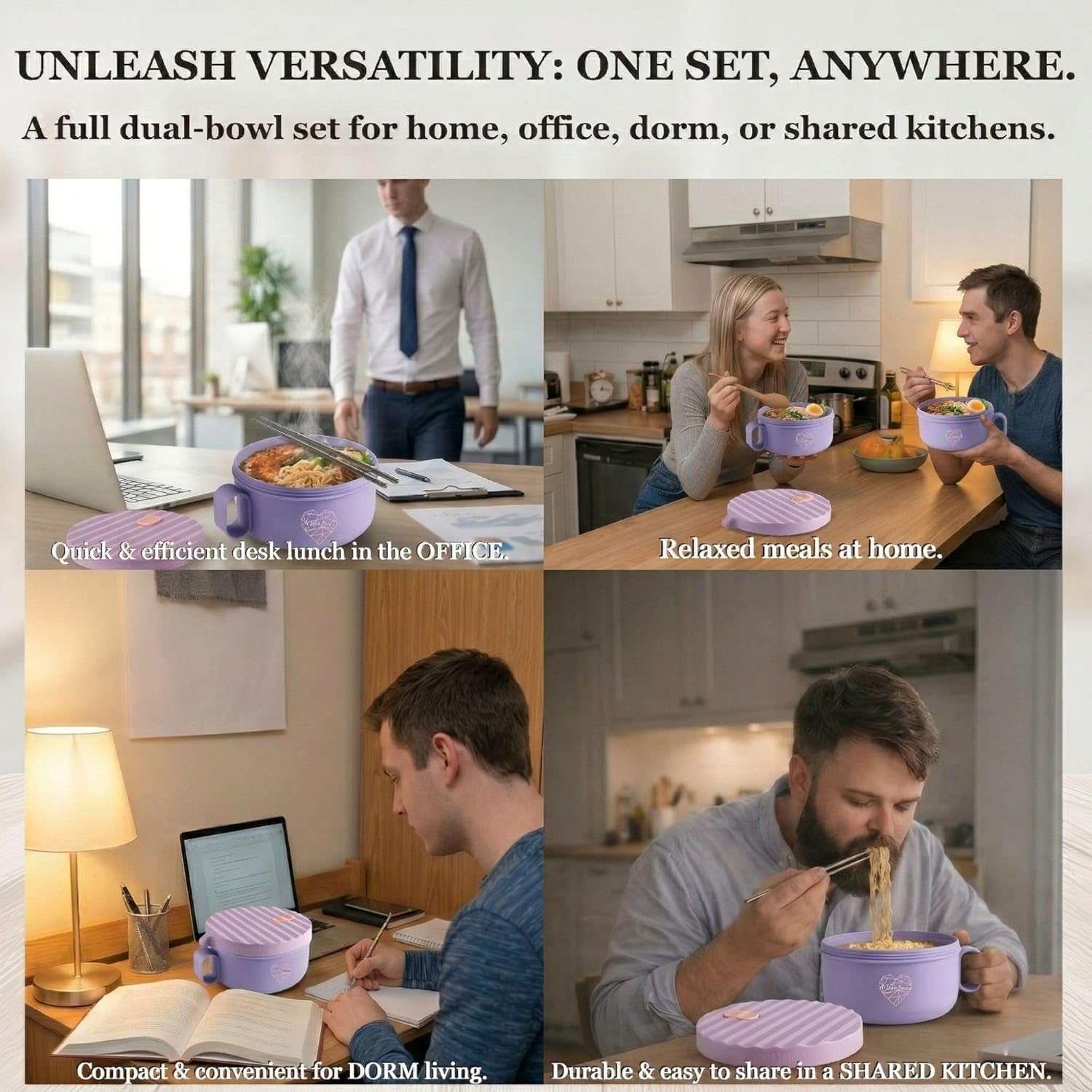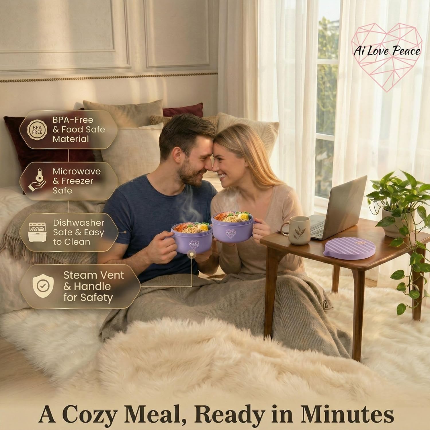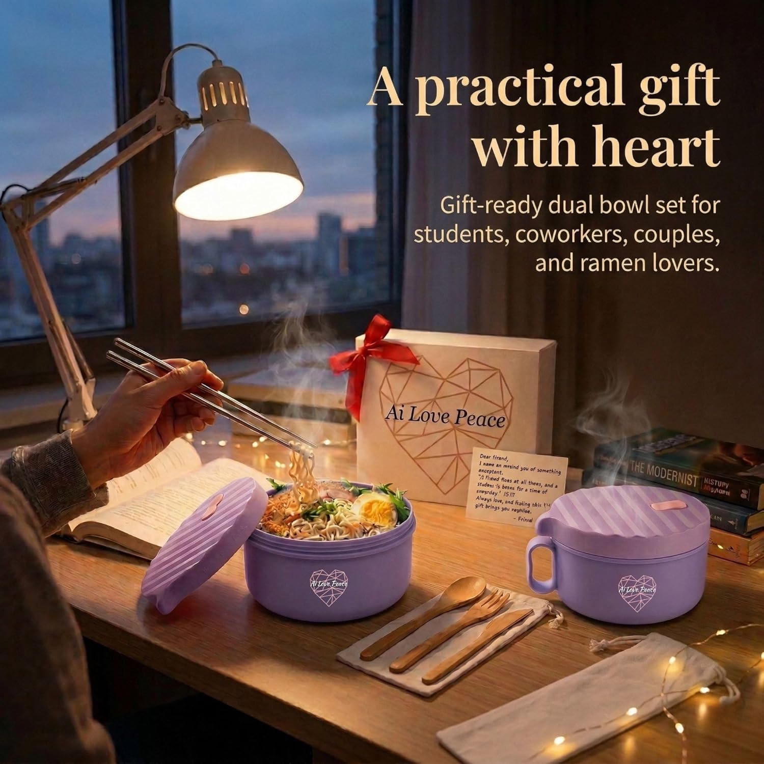 Enjoy a delicious and convenient meal with the Ai Love Peace Microwavable Ramen Bowl Set. Perfect for making instant ramen, pho, or using as a soup container with a removable lid, this versatile 40 oz ramen maker is ideal for home, office, or dorm use. The ramen noodle microwave bowl is designed for fast and even cooking, allowing you to prepare your meal in minutes. Made from BPA-free, food-grade material, this microwave-safe bowl ensures safe usage and easy cleaning in the dishwasher. The removable lid with a vent allows steam to escape, and the built-in chopsticks compartment keeps your utensils close at hand. Lightweight and portable, this ramen bowl is also freezer safe and compact for easy storage. Whether you’re enjoying a quick lunch or a late-night snack, this microwavable bowl with lid is your go-to solution for tasty, hot meals. or ramen enthusiasts! What's Inside? 2x Ramen Bowl with Lid 2x Chopstick 2x Spork 1x pouch Specifications: Material: Polypropylene & Silicone Dimensions (Diameter x Height): 7.2” x 3.74” / 18.3 cm x 9.5 cm Capacity: 1200 ml / 40 fl. oz. This product is protected under the design patent number 202030701722.6, ensuring its unique design is legally recognized and safeguarded.