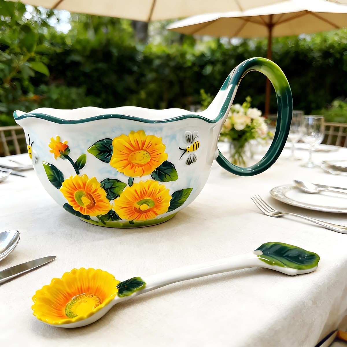 | Product Style | Sunflower - 35.27 Oz - Handmade Relief Loop Handle Soup Bowl with Spoon |