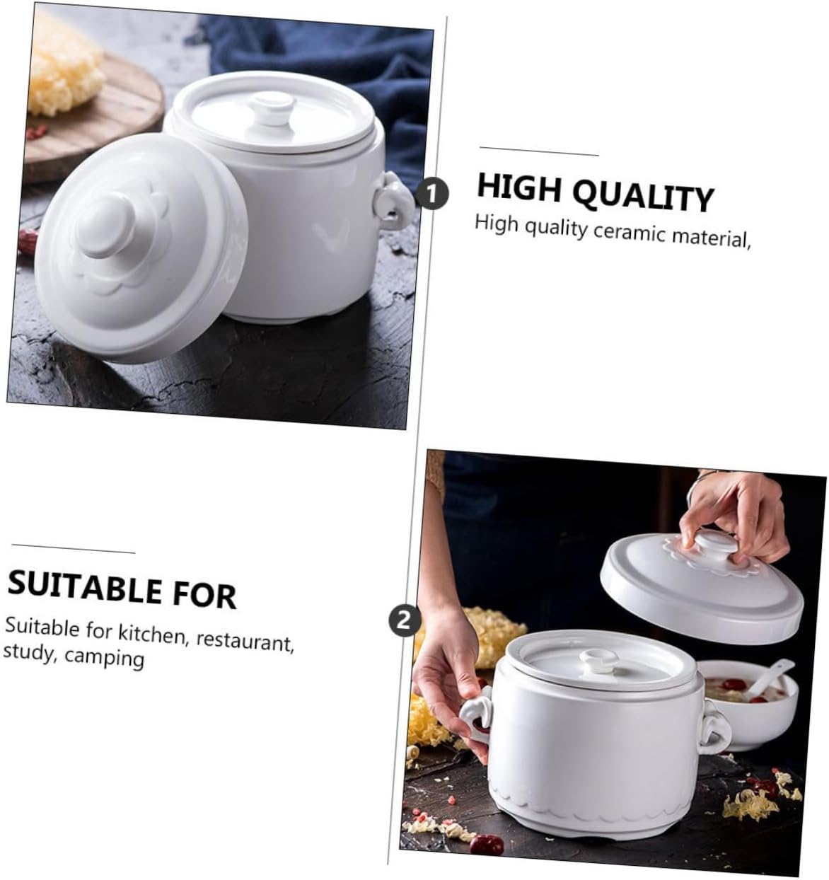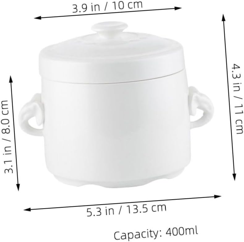 Package List 1 x Storage Container Characteristics - Material: Ceramics stew cup - Size: 12.00X9.50X10.50cm/4.72X3.73X4.13in mini stew pots with lids. - It is easy to use and easy to clean, which brings great convenience to your life stew pots with lids. - The products are in workmanship, safe to use, comfortable and stew bowl with handle. - Small size, great use, multi-function bowl, practical small stew pot with lids. - , can be used to steam eggs, steam pudding, steam double skin milk, stewed bird's nest, stewed white soup etc cereal white pots with lids. 14.50X10.50X12.50cm/5.70X4.13X4.91in porcelain soup bowls with lids. 13.50X10.00X11.00cm/5.31X3.93X4.32in pot with handle. - Suitable for living room, dining room, hotel, coffee shop, dining room, etc bird nest soup bowl.Goods Informationporcelain stew pot with lid The lid design locks and keeps health.soup bowl with handle Can high temperature Steaming, handle design, easy to take.stew cups and small, safe and .stew pots with lid This sturdy ceramic bowl has and is suitable for making steamed eggs, desserts, bird's nest, soup, salads, ice cream, etc