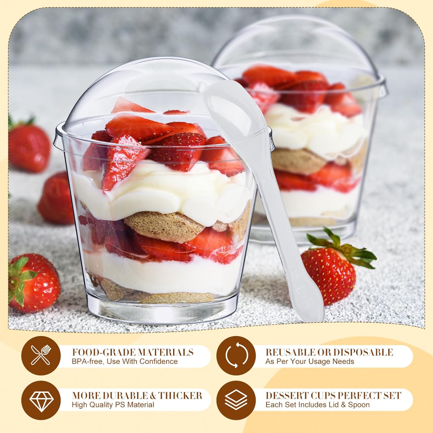 | Included Components | 150 x Mini dessert cups, 150 x Spoons, 80 x Cup lids |