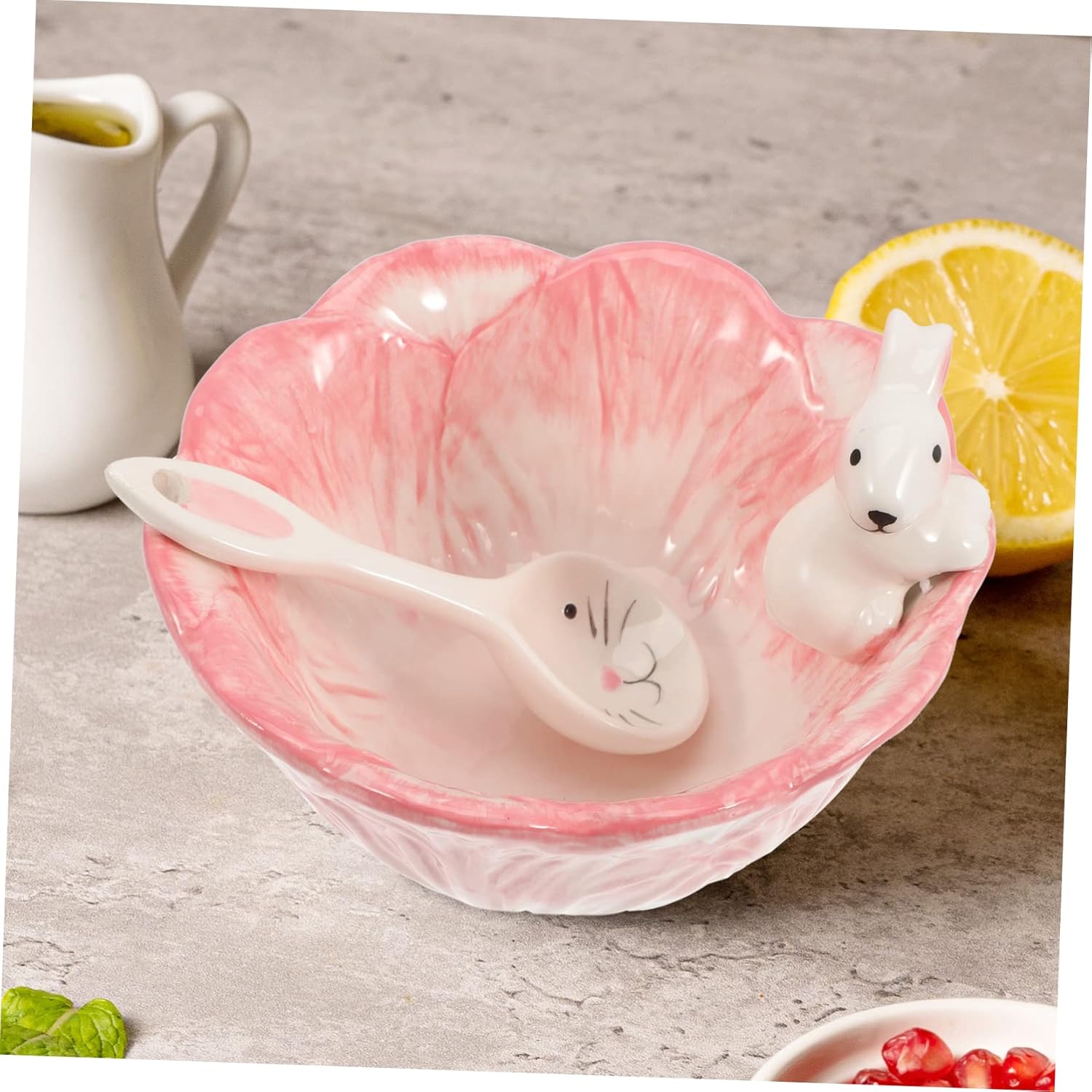 Package Include 1 x Ceramic Bowl 1 x Spoon Features - Bowl Size: About 18.50X18.50X13.00cm/7.27X7.27X5.11in kitchen bowls - Material: Ceramic bowl for dessert - Spoon Size: About 12.5x4.5x3cm/4.92x1.77x1.18in Snack Bowl - The smooth ceramic bowl is very convenient to clean and will not hurt your hands household food bowl. - Unique appearance and beautiful modeling, with fine workmanship and delicate design ceramic food container. - You can put some delicious dishes, cold dishes, desserts, and other food in ceramic bowl snacks storage bowl. - ice cream bowl - The bowl will add color to your dinning table or party, which will leave you and your guests an unforgettable memory bowl for home. - Ceramic bowl is a display tool for your cake, suitable for wedding, party, birthday to use ceramic bowl.Goods DescriptionRabbit design bowl Excellent for breakfast, dinner, or party, family gatherings and more.multi-function bowl Made of ceramic material, and , hard to damage.seasoning bowl Provide impeccable service for everything from main courses to appetizers, desserts, and more