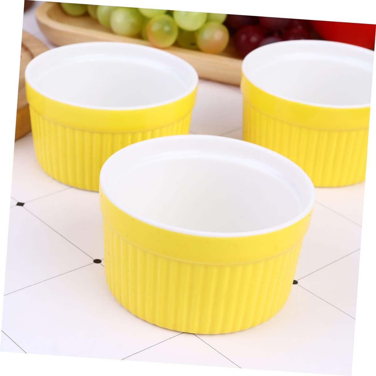 Package Include 5 x Bowl Features - Size: About 9 x 9 x 5cm small bowl. -Product Info:Ceramic baking bowl - Color: Yellow. - Material: Ceramic. - Creative and chic design, very and delicate ceramic rice bowl. - A set of good gifts for your friends, they will like it very much baking bowls. - Suitable for soup, rice, egg custard, vegetable, for home ceramic soup bowl. - Made of ceramic material, the bowl won't absorb , flavors or colors, it's sturdy and environmental, used of more assured chic soup bowls. - Also an home decoration props.Goods Informationceramic soup bowl A set of good gifts for your friends.baking bowls This is a set of 5pcs wicker handleless bowl, which is made of food grade ceramic material which has a good stability.ceramic rice bowl Suitable for soup, rice, egg custard, vegetable, for home