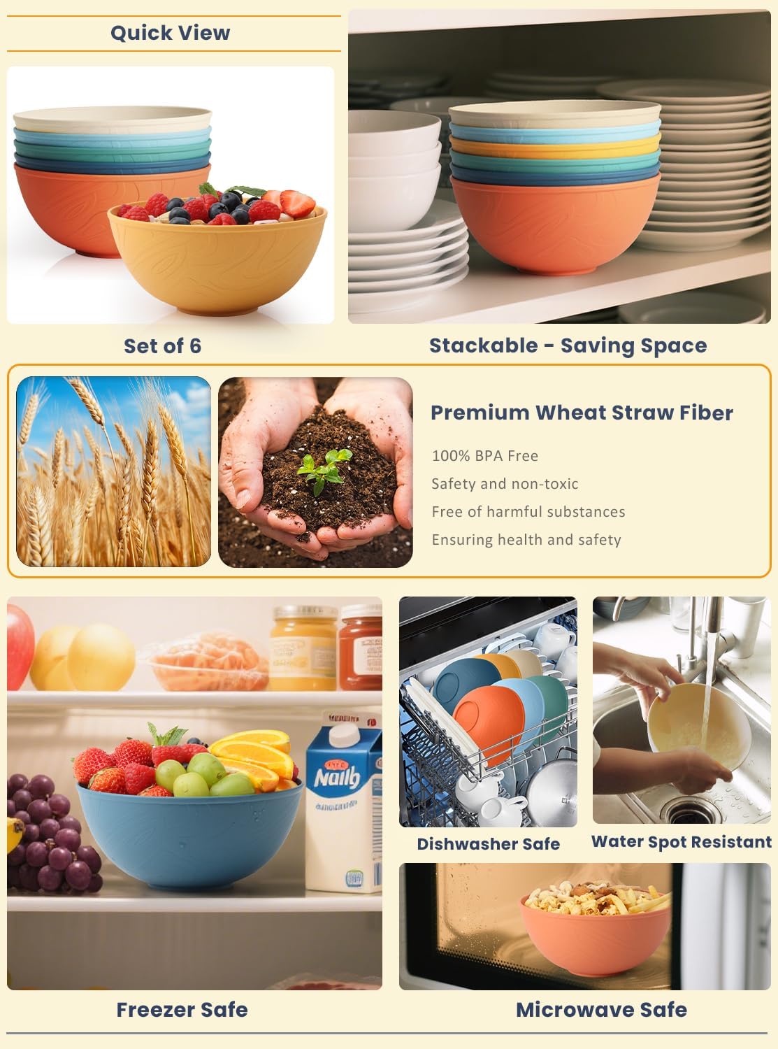 Imagine transforming your dining experience with our 18-piece wheat straw dinnerware set. Featuring a classic art aesthetic, this collection brings a visual feast and a touch of elegance to your table. It includes 12 dinner plates and 6 cereal bowls, all carefully designed to meet the dining needs of you and your family or friends. Made from premium wheat straw fiber, our plate and bowl sets is lightweight and unbreakable. It's perfect for outdoor camping, picnics, as well as kitchens and RVs. Enjoy your meals without worrying about accidental breakage. The classic colors add a modern touch to your table setting. The dinner plates are 9 inches in diameter, perfect for showing your love for food. The 40 ounces bowls feature a well-considered capacity that meets your daily needs. Their unique texture design adds a touch of charm, making mealtime not only comfortable but also visually pleasing. Despite their large size, our dinnerware set is lightweight, thanks to the premium wheat straw material. Unlike heavy glass or ceramic bowls, they are easy to handle and won't strain your hand joints. Each piece is microwave and dishwasher safe, making cleanup effortless.Plus, they are unbreakable and resistant to shattering, making them a practical and reliable choice for everyday use. Choose our 18-piece wheat straw dinnerware set and elevate your dining experience. Not only is it practical, it also adds a stylish touch to your table. This beautiful and practical set deserves a place in your kitchen, turning every meal into a pleasurable experience and every moment into a ritual.