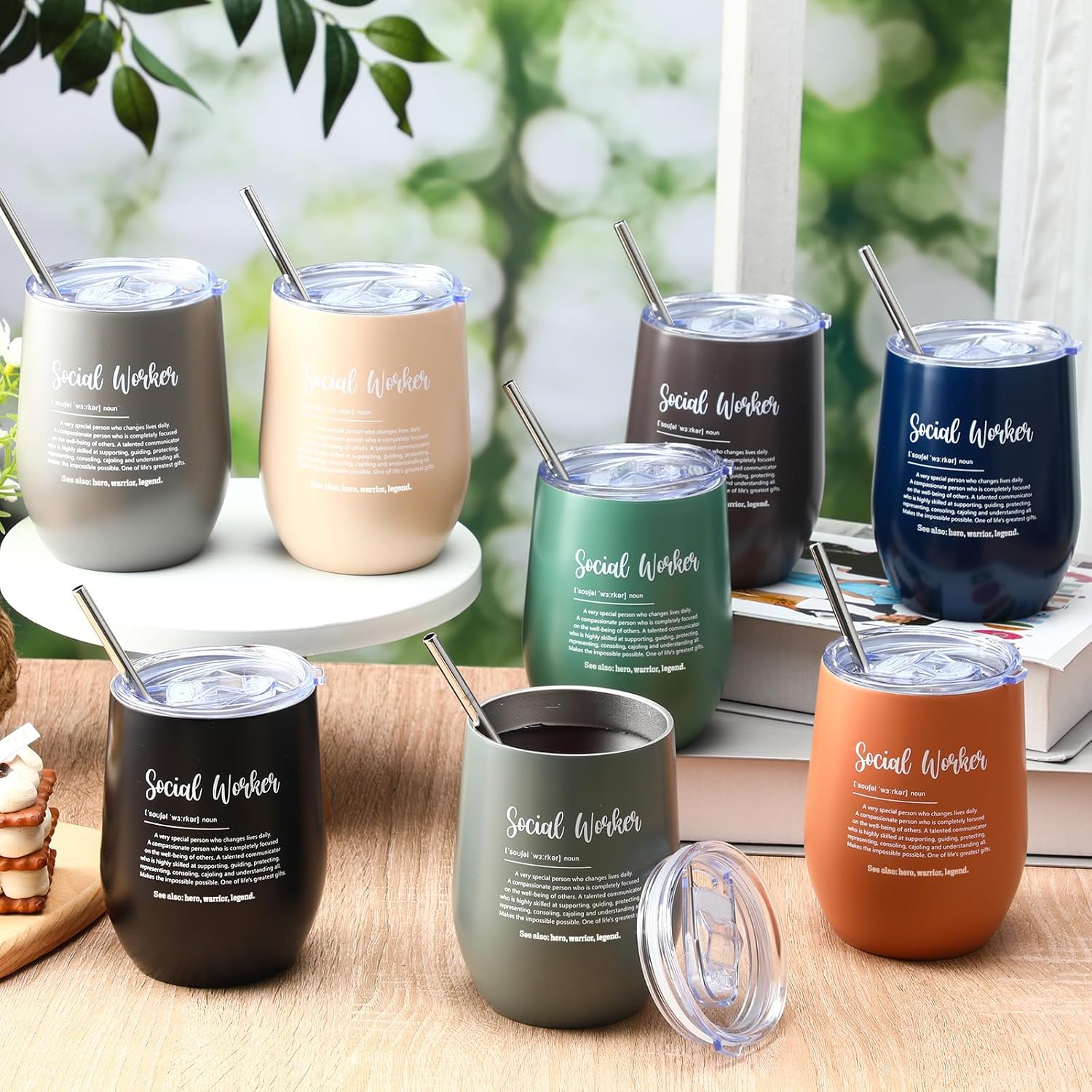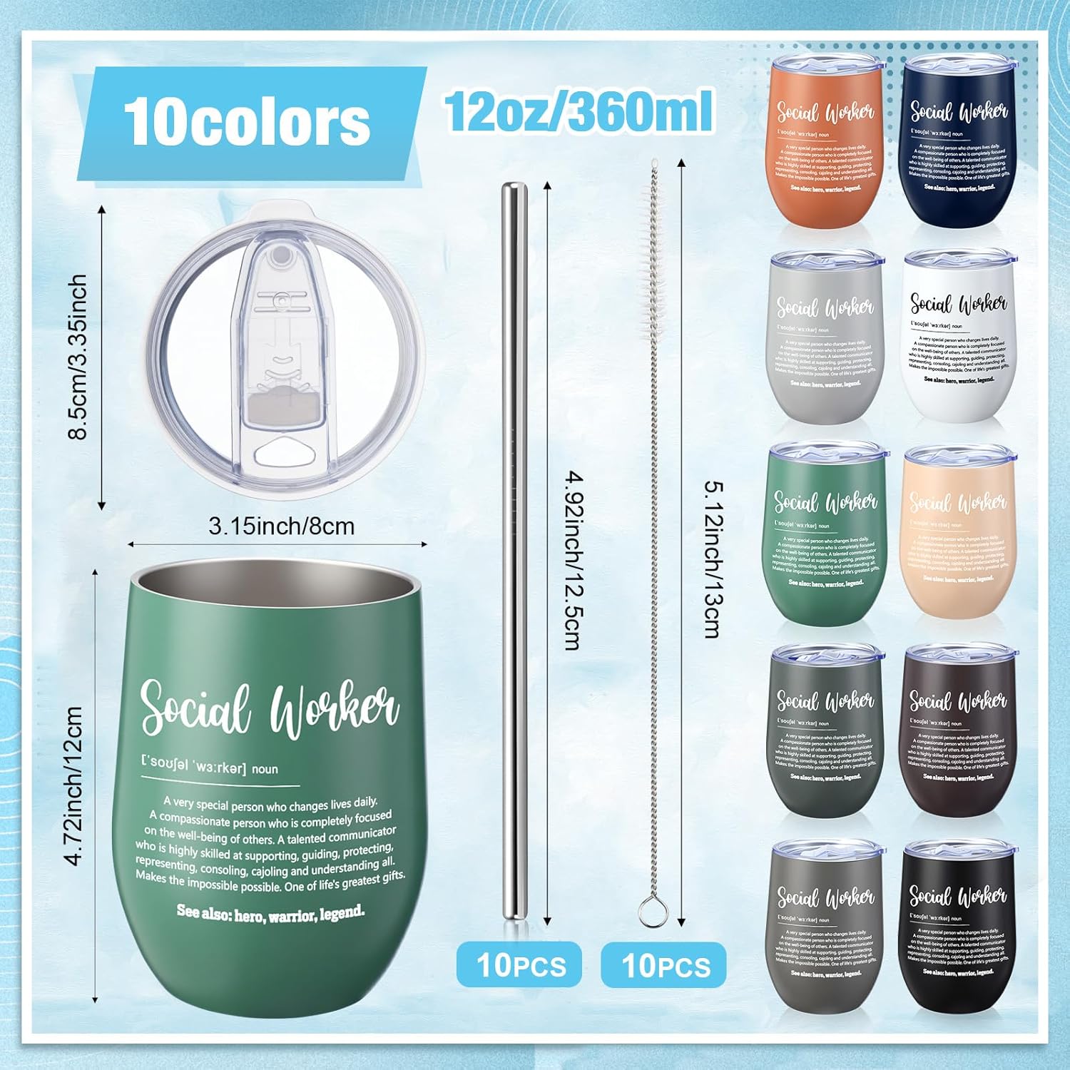 Features: Durable and Easy to Clean: Made for everyday use, these social worker gifts are crafted from rust-resistant stainless steel and come with reusable straws and brushes for effortless cleaning. The spill-resistant lid adds convenience, making it a reliable companion for busy social workers on the move Reusable Choice: These social worker appreciation gifts promote sustainability with their reusable design. Special and warm words printed full of gratitude and thanks Specifications: Material: stainless steel Color: multicolor Size: 12 oz in capacity Package includes: 10 x Social worker tumblers 10 x Brushes 10 x Straws Notes: Manual measurement, please allow slight errors on size. The color may exist a slight difference due to different screen displays.