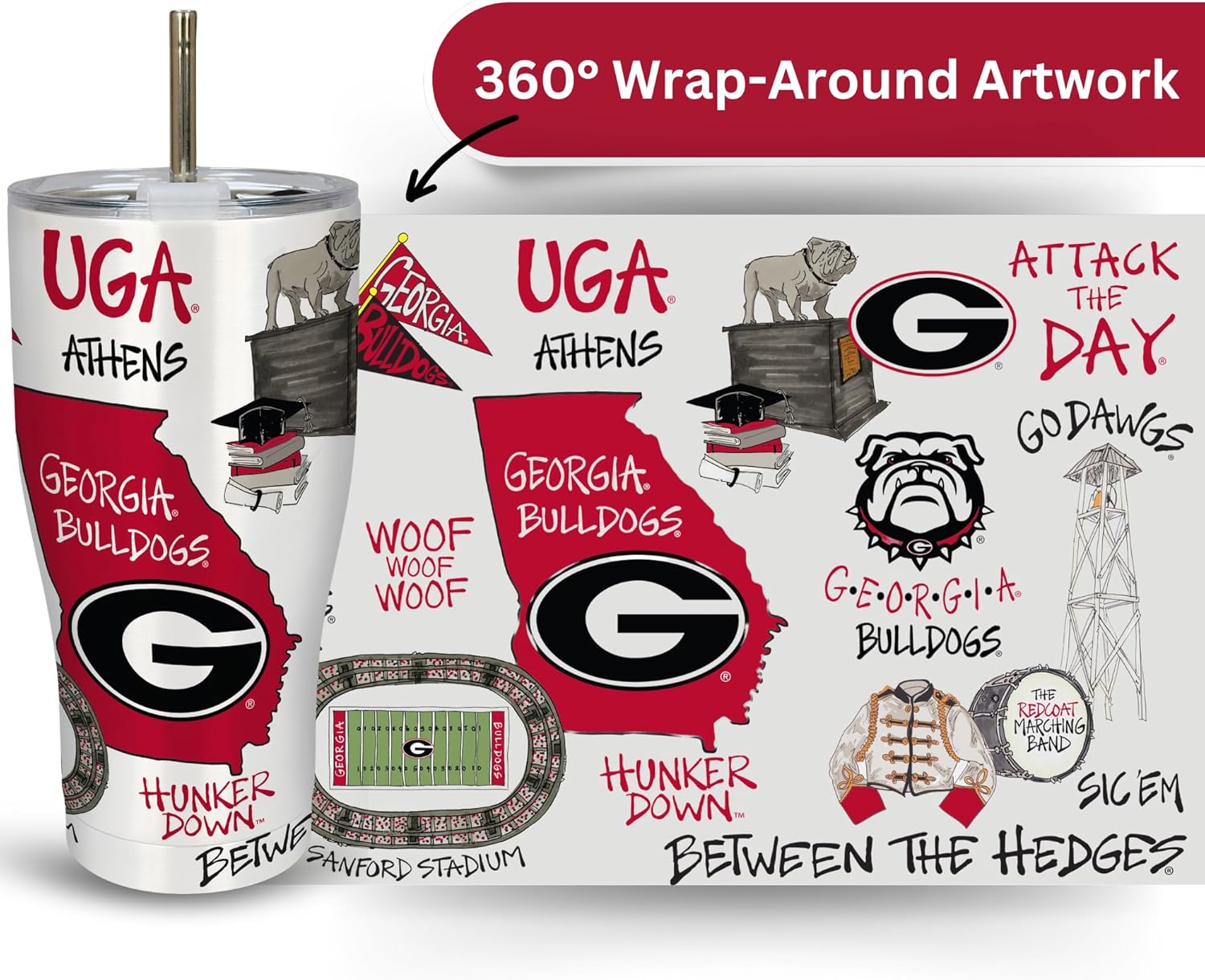 University of Georgia 30oz Stainless Steel 3D Icon Travel Mug– High Performance Double-Walled Thermos w/ Convertible Lid & Straw – Insulated Decorative NCAA Beverage Tumbler – For Hot or Cold Drinks Get your tickets, get into your jersey, and stay hydrated for the gameday tailgate with the University of Georgia 30oz Stainless Steel 3D Icon Tumbler from Magnolia Lane! Our premium thermos is the perfect addition to any Bulldogs superfan looking to take their season to the next level. With unique artwork and iconic imagery, our drink holder will help make the school year even more unforgettable. Featuring a physically different & visually interesting collage of all your favorite UGA landmarks in stunning three dimensional style, your drink will feel as good to hold as it is to look at, and look as great as it tastes. Our 304-grade stainless steel, double-walled, vacuum-sealed cup keeps your tea, hot chocolate, and coffee hot for up to 4 hours, or your water, frappe, and other refreshing brews cold for 12 hours. Our no-sweat cup includes a leak-proof acrylic lid and metal straw, and makes a great gift for men and women, for many occasions: birthdays, Christmas, Mother’s day, Father's day, or graduation. This vessel will be a great addition to your dorm, classroom desk, or backpack for on-the-go! Top-rack dishwasher safe.At Magnolia Lane, we produce gifts that become part of celebrations, memories, and family treasures.