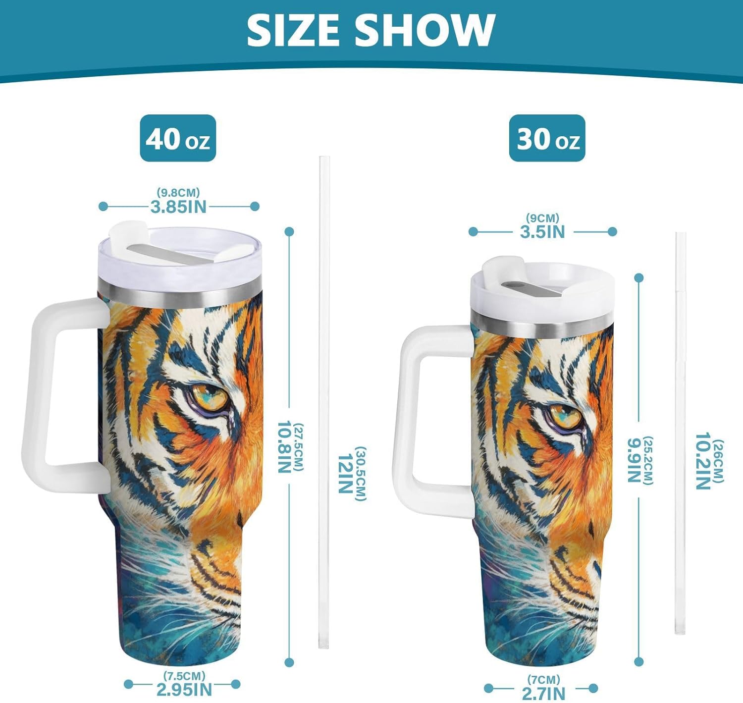 Specification Material: food grade 18/8 stainless steel + food grade PP + food grade silicone Size: 40oz - 10.8(H)x3.85(D)in (27.5(H)x9.8(D)cm) 30oz - 9.9(H)x3.5(D)in (25.2(H)x9(D)cm) Package: Insulated Tumbler*1+Mounting Accessories*1 Why choose our Tumbler: -Food grade stainless steel material, healthy and safe drinking water, BPA free. -Double-layer vacuum construction, excellent thermal insulation. -Fit size design, can be placed in car cup holder. -Side handle design, comfortable to carry. -Leak-proof straw lid design, allows 2 ways of drinking. -Completely removable for cleaning. -Unique and cute printing design, show your personality. Keep Warm Time Keep warm time: 8 hours (return to room temperature), keep cold time: 10 hours (return to room temperature). Special Reminder The product is received without the installation of the handle state, there is a gift of screwdriver and accessories, customers need to install their own. Applicable Great for traveling, hiking, camping, going out and working. Perfect fit for car cup holder. Warm Tips Due to the different types of monitors, the actual color of the product may have a slight deviation.