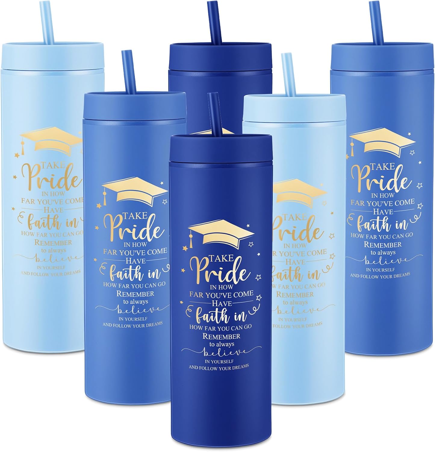 • 12 Graduation Tumblers Package: about 8.27 x 2.76 inches/ 21 x 7 cm, with its practical size, our tumbler grad gifts are skinny to fit conveniently in your hand; The package includes 12 tumbler set, each with its own lid and straw, making it a suitable ensemble for the graduation toast or as a party favor for the attendees