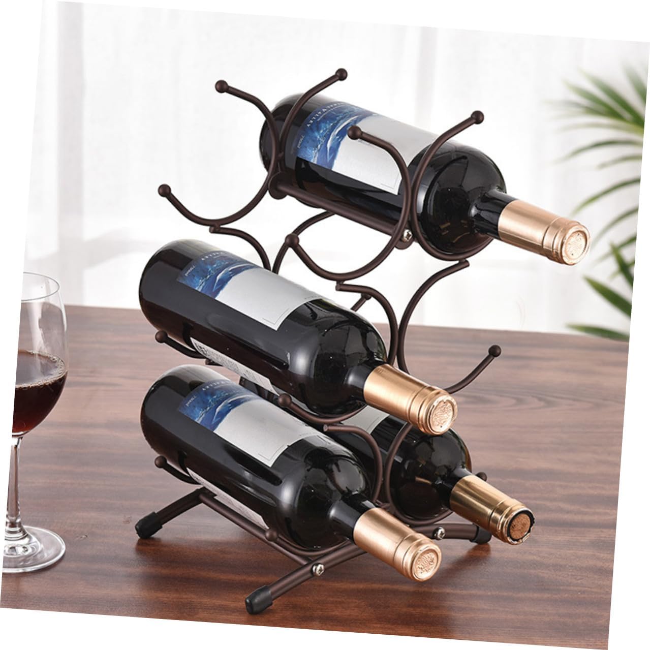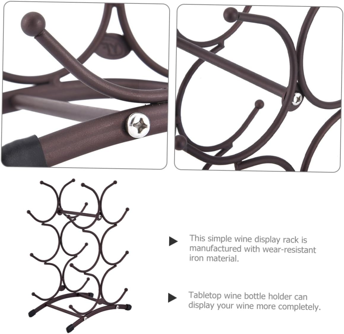 Package List 1 x Wine Rack Features - Material:Iron - Size: 35.50X23.00X16.00cm/13.95X9.04X6.29in -Product Info:Red wine rack - This display stand is made of sturdy and stable iron material, sturdy and practical for longtime use. - It can be given as a to friends who like to collect red wine. They will like it very much tabletop wine racks . - Detailed workmanship practicability and durability. You can use it with confidence wine rack tabletop. - ColorDark Brown - This wine bottle holder is very suitable for homes, hotels, bars, restaurants, shops and other places iron wine bottle display rack. - Not only can it be used as a wine bottle display stand, this wine bottle holder is also a perfect home decoration countertop liquor rack.Goods Informationiron wine bottle holder This simple wine display rack is manufactured with wear-resistant iron material, sturdy and practical for lasting use.iron wine bottle display rack Tabletop wine bottle holder can display your wine more completely, and its creative and decorative shape also make it become a decoration for your home