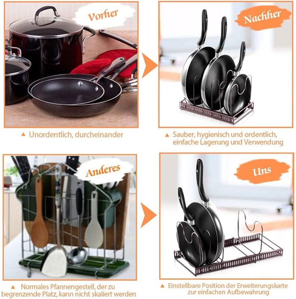 Feature:Stainless steel material, longer service life.Specification:Product Nmae:Pan Rack OrganizerSize:30 x 18 x 18 CMColor:BronzeTires:7 TiresDescription:-Ideal for all kitchens and spaces, its unbeatable versatility perfect fit across all cupboards, cabinets, and worktops.-This pan rack organizer comes with 7 adjustable dividers, so your frying pans, sauce pans, bakeware and pot lids can easily fit into the pan rack.-Our pan rack organizer is adjustable from 11 inches up to 23 inches which allows the flexibility to store in a pantry, cabinet, under the sink, or on countertop.-Upgrades design, each divider of our heavy duty pot rack is coated with silicone gel. Anti slip and anti scratch. Your cookware won't be easily scratched by this kitchen rack.Package included:1x Pot Rack(other item not included)Note:· The actual manual measurement may not be accurate. The actual size is subject to the actual product.· Du to light and shooting conditions, the color of the picture may be slightly different from the actual product. Please be based on the actual product.