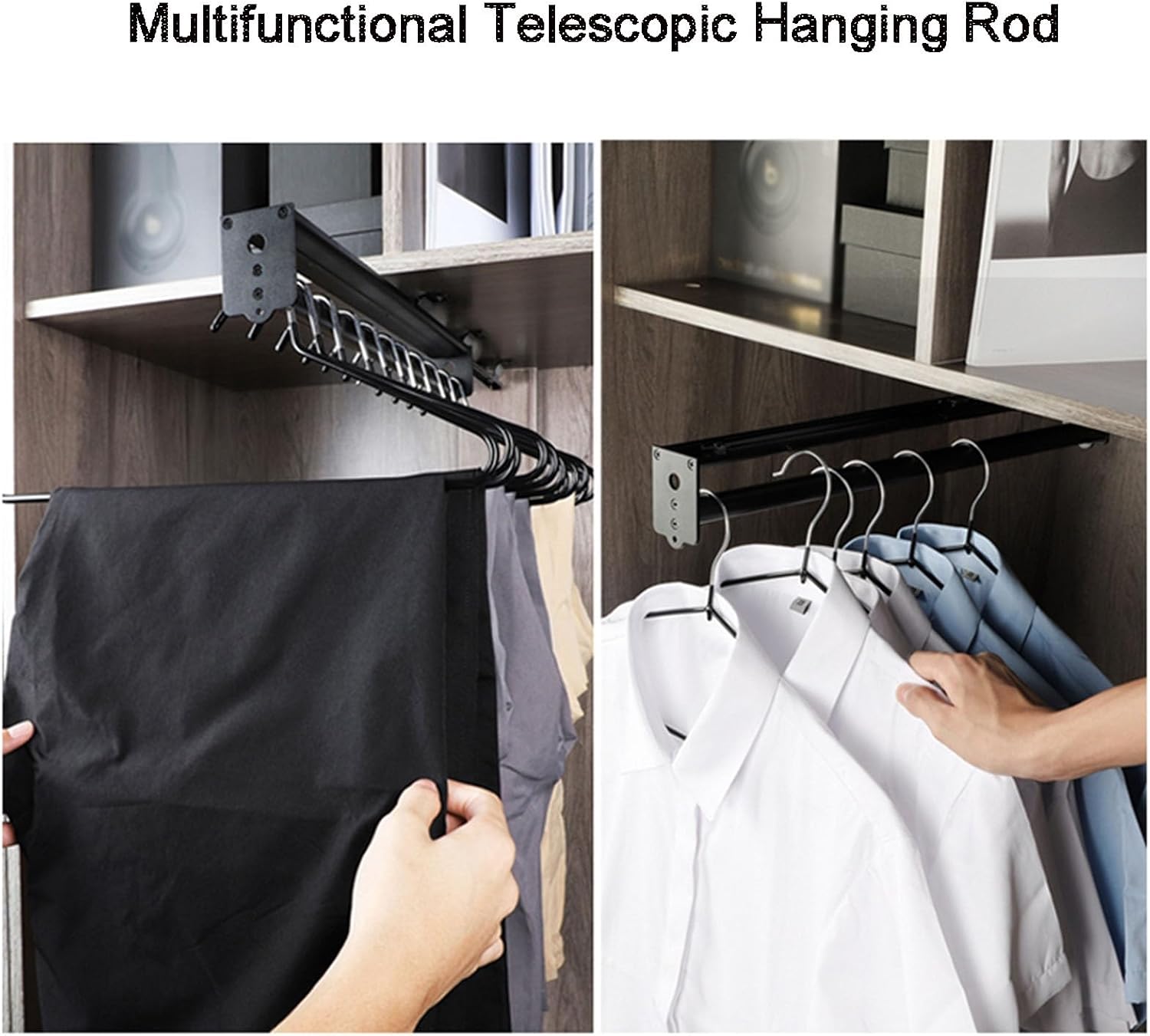 Product DescriptionDiscover the ultimate solution for your closet organization with our Pull-Out Clothes Rack. This versatile wardrobe clothes rack is expertly designed for storing pants, jackets, jeans, and other garments, making it an essential addition to any modern home. Whether you're optimizing a small dormitory, laundry room, or bedroom, this adjustable closet clothes rack enhances space efficiency and keeps your clothing neatly arranged.Product Name: Pull-Out Trouser Rack / Retractable Closet Rod / Adjustable Clothes Hanger RodMaterial: High-Quality Aluminum AlloyAssembly Required: YesRoom Type: Dormitory, Laundry Room, BedroomMounting Method: HangingLoad Capacity: Approximately 30kgFeatures:1. Designed for easy installation within your wardrobe, this pull-out trouser rack offers a seamless integration into any closet space.2. The innovative slide-in design allows for smooth operation, providing easy access to your clothing without clutter.3. With a secure assembly that attaches to your shelf, the removable rack slides out effortlessly, making it simple to organize and select your outfits.Includes: 1 trouser rack and all necessary assembly accessories.Notes:1. Additional items shown in images are for illustrative purposes only and are not included with the purchase.2. Due to variations in lighting and monitor displays, the actual color of the item may differ slightly from what is shown. Please refer to the actual product for color accuracy.3. Dimensions are manually measured and may vary slightly (0-2 cm). Please check the actual product for precise measurements.