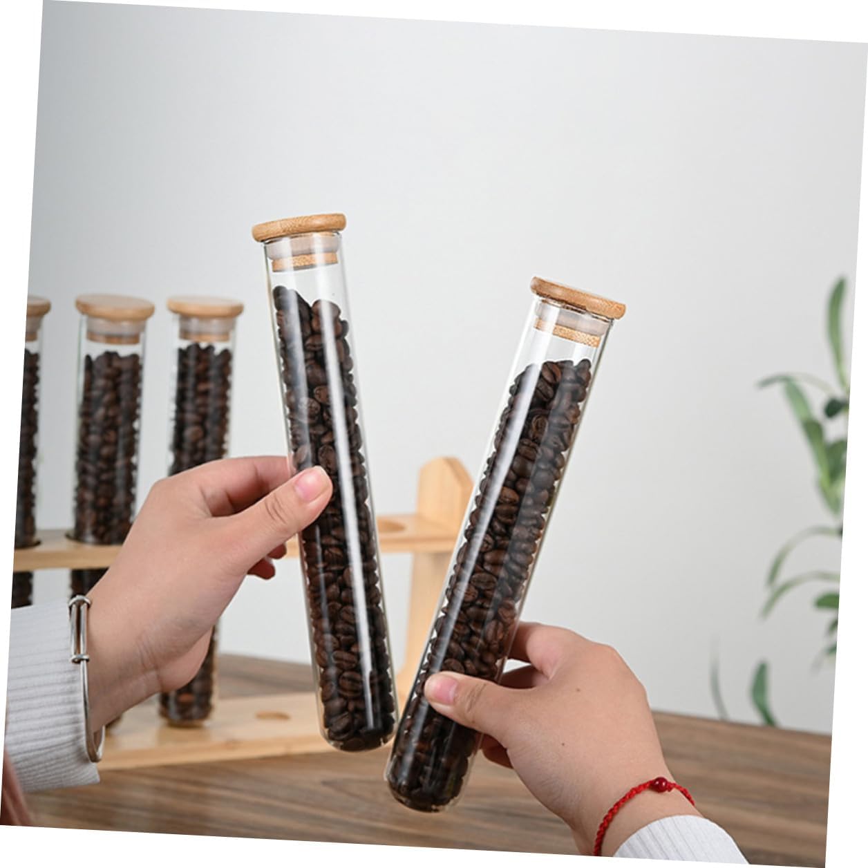 Package Include 6 x glass tubes 1 x wooden stand Features -Product Info:Coffee beans bottling -Size:35.50X15.00X7.00cm/13.95X5.89X2.75in(wooden stand) - Space-saving display rack: the rack can hold many test tube-style jars, making the full using of your space Coffee Bean Tube With Stand. - Wooden and glass material: made of and clear glass material, with a sleek and modern design. -Size:22.50X4.00X4.00cm/8.84X1.57X1.57in(tube) - Versatile use: suitable for home, office, or coffee shop use, and can be used for storing and displaying storage tube. - Multi-functional: This set can contain coffee bean storage sealing jars, and a display rack, very convenient glass coffee beans storage tubes. -Material:Wooden, glass -Color:Transparent - Sealing lids for freshness: the airtight lids keep coffee beans fresh for longer periods of time, very useful coffee storage tube.Goods Informationcontainer for coffee The small glass tubes are safe for storage of your coffee beans, while the wooden stand can help you to store and display these glass tubes with coffee beans.coffee bean display Do you like drinking coffee? Are you looking for a container to storage or display your coffee beans? If yes, I think that you can take at your glass coffee bean storage tubes with wooden stand