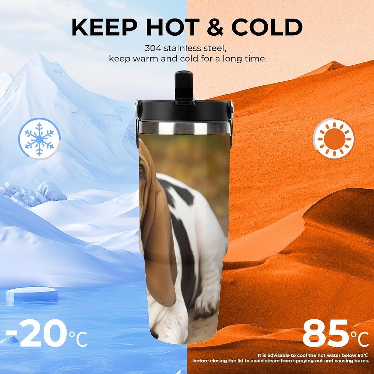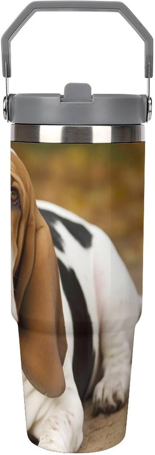 Our Basset Hound travel water bottle is made of food-grade stainless steel. The wide mouth design makes it easy to clean and add ice, and the powder-coated exterior is non-slip and durable, ensuring driving safety.Whether you prefer sipping or quenching your thirst, this personalized insulated mug has you covered. Featuring a splash-proof straw design, a sealing ring securely holds the reusable straw, and a drinking spout and full-coverage lid for enhanced leak-proof performance, this mug allows you to easily carry ice water to work, meetings, the gym, or on trips.You can give it to your friends and family as a birthday, Mother's Day, Father's Day, New Year's, Thanksgiving, and holiday gift. It's a thoughtful present.