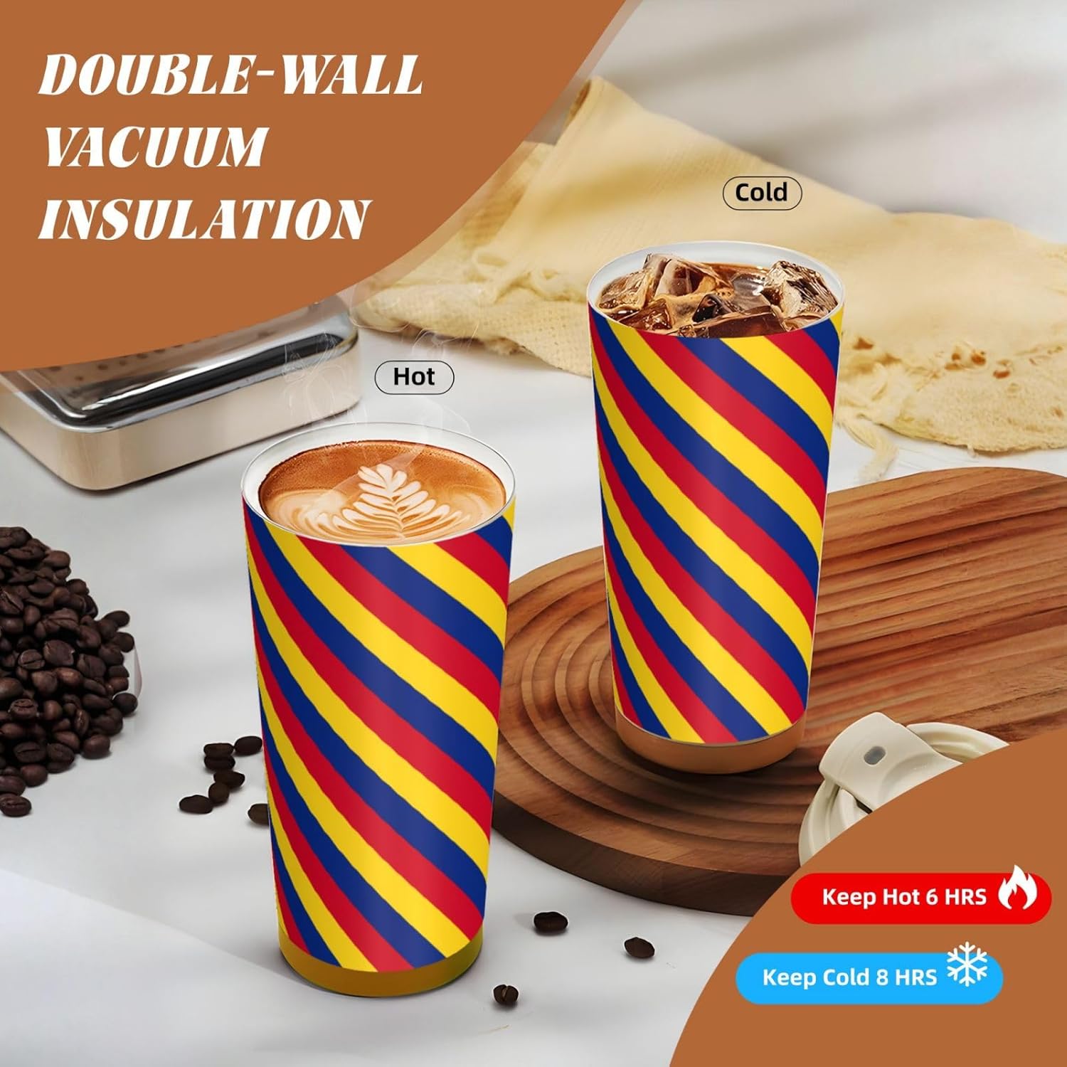 This Flag of Romania Print travel Coffee Mug supports three drinking modes: the direct drink spout for quick drinks during commutes, the straw port for iced coffee and other spill prone beverages, and the open top design that replicates the traditional coffee cup experience. BPA Free 316 Stainless Steel, Safe and Durable Inner liner made of food grade 316 stainless steel, non toxic, odorless, BPA free, safe for long term use.