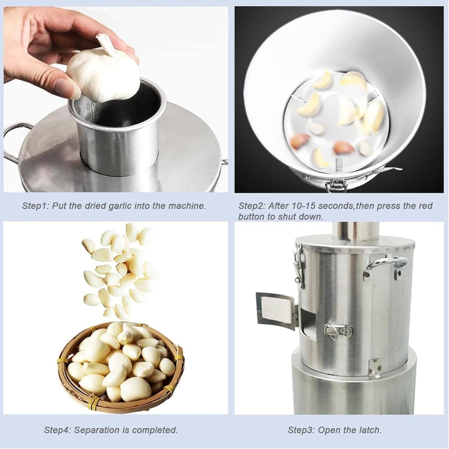 Features: 1. The whole garlic peeling machine adopts stainless steel body, which is corrosion-resistant. 2. It adopts pure copper core motor, which has high power and fast garlic output 3. It is equipped with large radiator/anti-slip feet, which dissipates heat quickly and works stably for a long time 4. It is equipped with special separation leaf plate for quick peeling 5. Can be learned in one go,It saves time and effort to peel the whole garlic Specifications: Name: Whole Garlic Peeling Machine Material: Stainless Steel Motor Power: 200W Efficiency: 30kg/h Peeling Rate: 98% Weight: 9kg Machine Size: 24*24*4 8cm Packing Size: 54*31*30cm Packing list: Whole Garlic Peeling Machine*1 Instruction Manual*1 About Peeling: 1. The garlic machine can only peel dried garlic, and the whole garlic can be dried and put in 2. The peeling rate of red garlic/purple garlic/single garlic is low 3. Wet and fresh garlic cannot be peeled 4. The garlic peeled by the machine will be slightly damaged (suitable for self-use in restaurants, barbecue restaurants, hotels, western restaurants) 5. The main function of the machine is high efficiency, which solves the problem of slow and painful manual peeling Precautions For Use: 1. Before turning on the machine, carefully check whether there are any debris in the peeling bucket 2. Make sure the machine cover is locked 3. Put the garlic to be peeled into the funnel, and it is best to take out the dry garlic, and the peeling rate will be higher 4. Before cleaning and disassembling, the power supply should be disconnected and the machine should be stopped 5. During processing, do not press the switch with wet hands