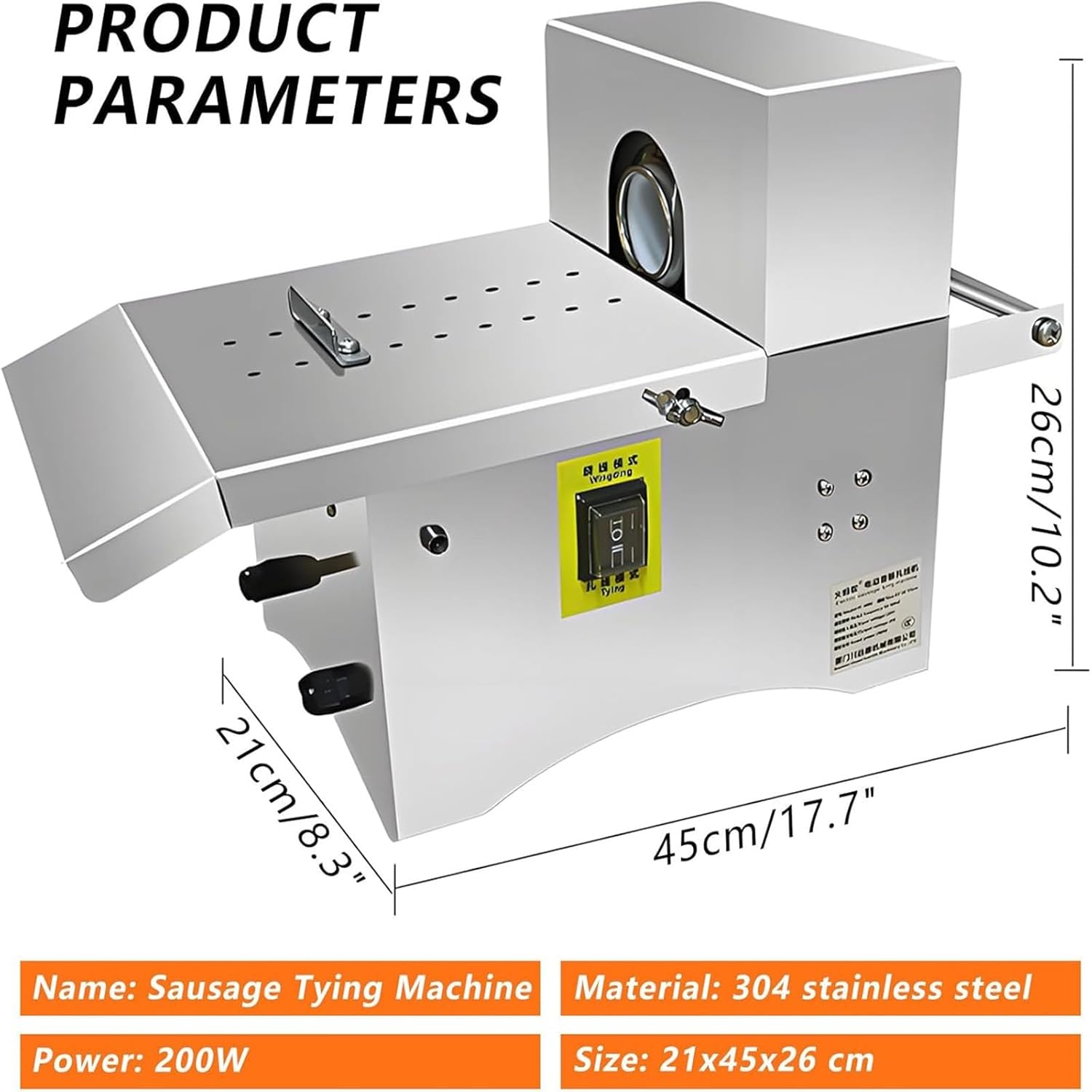Hey! No more worries about tying sausages! This electric helper gets it done quickly and easily, perfect for both commercial and home use!Features:1. Waterproof foot switch allows hands-free, safe operation, letting you concentrate on feeding sausages.2. Made of stainless steel, easy to clean, corrosion-resistant, and sturdy for home and restaurant use.3. Easily adjust tying length and knot tightness for all sausage types, from light to heavy.4. Large thread rolls enable processing many sausages without frequent thread reloading, boosting productivity.Specifications:Product Name: Automatic Sausage Making MachineMaterial: Stainless steelVoltage: 110V, 220V-240VPower: 200WMax Diameter: 50mmProduct Size: 45x21x26cm/17.72x8.27x10.24inPackage Size: 45.5x25x29cm/17.91x9.84x11.42inPackage Weight: 8.5kg/18.74IbsPackage Included:1 x Sausage Knotting Machine1 x Footswitch1 x English Instruction ManualNote: 1. Color of this item may vary slightly from the pictures due to differences in light and screen configurations.2. Please allow slight size differences due to different manual measurements.3. For any inquiries, do not hesitate to contact us, and we will respond within 24 hours.