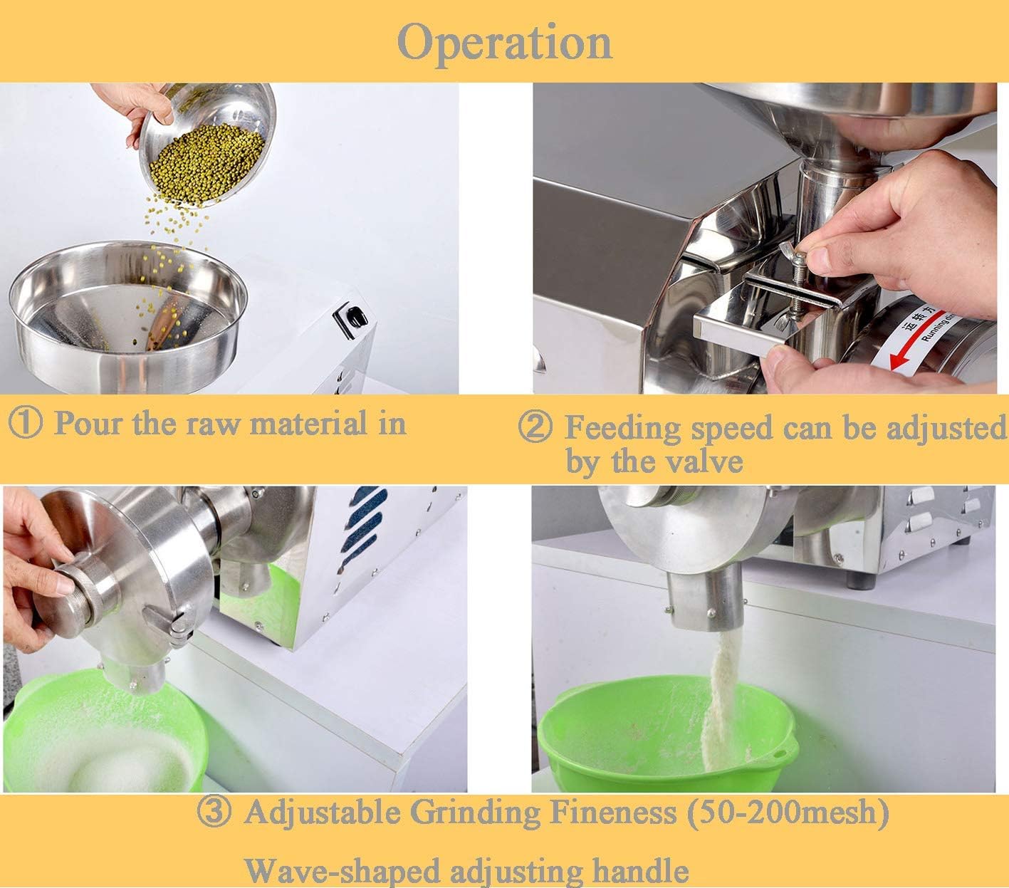 Specifications Material: Food grade stainless steel Voltage: 220V\110V Production Capacity: 30—50kg/h Power: 2.2KW Speed: 1400r/min Weight: 40kg Features 1, the whole body stainless steel design, never rust. 2, the motor installation overload protection, to avoid overloading the motor burned, convenient and safe. 3, special motor, low noise, strong power, stable performance. 4, the installation of four strong magnetic, adsorption grinding wear iron, clean and sanitary 5, oval-type discharge port, cutting faster, not blocking material. 6, continuous feeding production, high efficiency. 7, feed speed and material thickness can be adjusted. *: 2200 cereal cereal mill special motor: the drive shaft directly from the motor leads, no over, transmission performance is more stable, lower noise! Output shaft lengthened, grinding disc installed directly on the motor shaft, stable performance, low failure rate Note If you have any question,please contact us via email or massage Buying from Great Wall Instruments can enjoy the strict assurance of the quality and after-sale service.